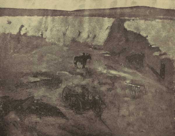 When the soldiers moved out of the valley, leaving so many graves behind them, the wolves rushed out from canon, ravine and den, to dig up the fresh earth and mutilate the dead. The shadow was there—a solitary, mysterious and vigilant sentinel to guard those sacred mounds. It screamed and gestured at the fierce beasts, it fired upon them with rifle and revolver and struck them with bright, keen sabre. The wolves ran here and there, from grave to grave, gnashing their teeth in anger, but the shadow closely pursued[33] them. They formed in groups in the midnight darkness and waited for the shadow to tire out and fall asleep or go away, but it paced up and down over the graves, vigilant and unwearied, and daylight came to hurry the wild beasts to their lairs till another night.