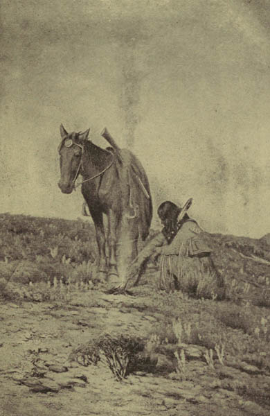 Old “Daddy” Stephenson sat in the shade of the ranch house, squinting his one eye toward the north, the other eye having been shot out a few years before. His squaw was boiling the leg of an antelope in a pot that swung under a tripod of sticks nearby, when “Doc” Kinnie and Charley Hayes rode up.