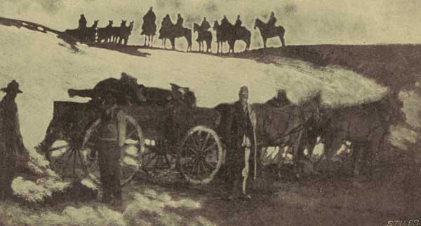 We were eight days out from Cheyenne, and several inches of snow had fallen during the night, but the sun rose clear on the biting cold of the morning. Suddenly we heard shots ahead. “Indians! Indians!” shouted one driver to another and then the wagons were quickly formed in a circle, the mules being unhitched and brought to the center of the circle.
