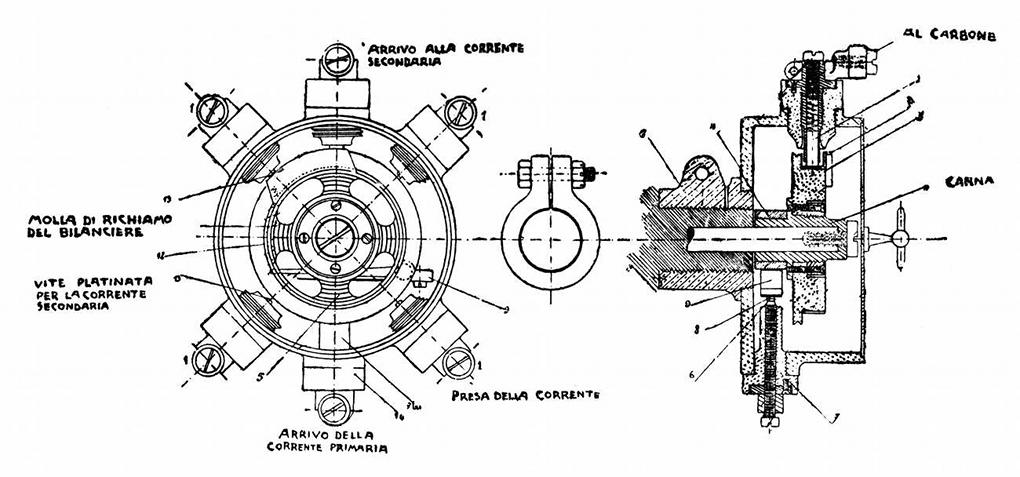 Dunque al punto E noi avremo funzionamento, cioè a dire rottura della corrente primaria; ma stante la debole velocità angolare, l'interruttore ristabilisce immediatamente il circuito, si produce al punto F un secondo funzionamento dell'interruttore, poi un terzo in G e un quarto in H.