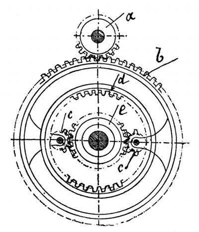 Esso è rappresentato schematicamente nella fig. x. La ruota b è dentata esteriormente e ingrana col pignone motore a. Questa ruota b porta due o più pignoni folli CC' ingrananti con una ruota dentata internamente d e montata sopra l'asse di una delle ruote del veicolo; gli stessi pignoni C e C' ingranano con una seconda ruota dentata esternamente l e montata sopra l'asse dell'altra ruota del veicolo.