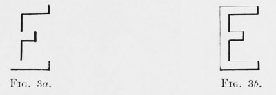 The importance of the mind's eye in ordinary vision is also well illustrated in cases in which we see or seem to see what is not really present, but what for one cause or another it is natural to suppose is present. A very familiar instance of this process is the constant overlooking of misprints—false letters, transposed letters, and missing letters—unless these happen to be particularly striking. We see only the general physiognomy of the word and the detailed features are supplied from within; in this case it is the expected that happens. Reading is done largely by the mental eye; and entire words, obviously suggested by the context, are sometimes read in, when they have been accidentally omitted. This is more apt to occur with the irregular characters used in manuscript than in the more distinct forms of the printed alphabet, and is particularly frequent in reading over what one has himself written. In reading proof, however, we are eager to detect misprints, and this change in attitude helps to[Pg 304] make them visible. It is difficult to illustrate this process intentionally, because the knowledge that one's powers of observation are about to be tested places one on one's guard, and thus suppresses the natural activity of the mind's eye and draws unusual attention to objective details. Let the reader at this point hold the page at some distance off—say, eight or twelve feet—and draw an exact reproduction of the letters shown in Fig. 3. Let him not read further until this has been done, and perhaps he may find that he has introduced strokes which were not present in the original. If this is not the case, let him try the test upon those who are ignorant of its nature, and he will find that most persons will supply light lines to complete the contours of the letters which in the original are suggested but not really present; the original outline, Fig. 3a, becomes something like Fig. 3b, and so on for the rest of the letters. The physical eye sees the former, but the mental eye sees the latter.