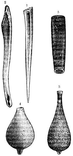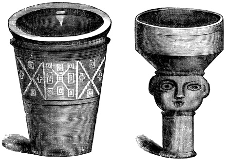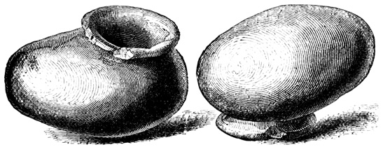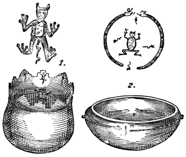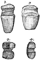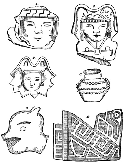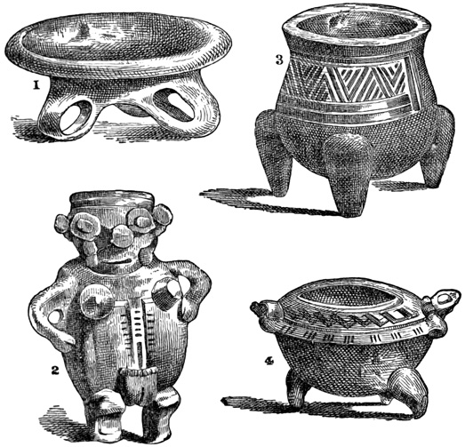 Drs Wagner and Scherzer, who traveled extensively in this region in 1853-4, found in all parts of the state, but more particularly in the Turialba Valley, which is in the vicinity of Cartago, traces of old plantations of bananas, cacao, and palms, indicating a more systematic tillage of the soil, and consequently a higher general type of culture among the former than are found among the modern native Costa Ricans. The only other antiquities seen by these intelligent explorers were a few stone hammers thought to resemble implements which have been brought to light in connection with the ancient mines about Lake Superior; but the locality of these implements is not stated. Cabo Blanco, reported by Molina[II-18] as containing the richest deposit of ancient relics, yielded nothing whatever to the diligent search of the German travelers; nor did 22 their failure here leave them sufficient faith to continue their researches on the island of Chira, where, according to the same authority, there are to be found ruined aboriginal towns and tombs. At San José they were told of figures of gold alloyed with copper which had been melted at the government mint, and they briefly mention hieroglyphics on a few ancient ornaments nowhere described.[II-19] Mr Squier describes five vessels of earthen ware or terra cotta obtained, in localities not mentioned, from Costa Rican graves. Four of these are shown in the accompanying cut. Fig. 1, symmetrically shaped, is entirely without decoration; Fig. 2 is a grotesque image supposed to have done duty originally as a rattle; Fig. 3 has hollow legs, each containing a small earthen ball, which rattles at each 23 motion of the vase; and the top of Fig. 4 is artistically moulded, apparently after the model of a tortoise's back. An axe of green quartz is also described, which to Mr Squier seemed to indicate a higher grade of skill in workmanship than any relic of the kind seen in Central America. The cutting edge is slightly curved, showing the instrument to have been used as an adze; the surface shown in the cut is highly polished, and the whole is penetrated by a small hole drilled from side to side parallel to the face where the notches appear. This implement seems to present a rude representation of a human figure whose arms are folded across its breast. Other implements similar in material but larger and of ruder execution, are said to be of not unusual occurrence in the sepulchres of this state.[II-20]