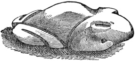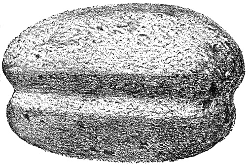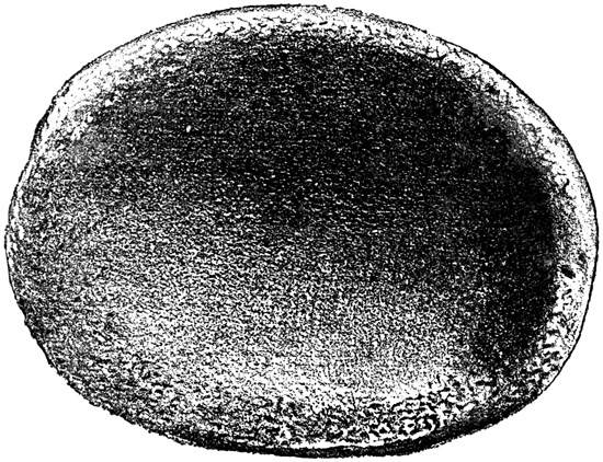 Mr Boyle makes the general statement that gold ornaments and idols are constantly found, and that the ancient mines which supplied the precious metal are often seen by modern prospectors. Dr Merritt also exhibited specimens of gold, both wrought and unwrought, from the (ancient?) mines of Costa Rica, at a meeting of the American Ethnological Society in February, 1862.[II-21] While voyaging on the Colorado, the southern mouth of the Rio de San Juan, Mr Boyle was told by a German doctor, his traveling companion, of a wonderful artificial hill in that vicinity, but of whose exact locality the doctor's ideas appeared somewhat vague. On this hill, according to his statement, was to be seen a pavement of slate tiles laid in copper; but the interesting specimens which he claimed to have collected in this neighborhood had been generously presented by him to museums in various parts of the world, and therefore he was unable to show any of 24 them.[II-22] Father Acuña, an enthusiastic antiquary of the Rich Coast, living at Paraiso near Cartago, reports an ancient road which he believes to have originally connected Cartago with the port of Matina, and to have formed part of a grand aboriginal system of highways from the Nicaraguan frontier to the Isthmus, with branches to various points along the Atlantic coast. The road is described as thirty-six feet wide, paved with rounded blocks of lava, and guarded at the sides with sloping walls three feet in height. Where the line of the road crossed deep ravines, bridges were not employed, but in their stead the ascent and descent were effected by means of massive steps cut in the rocky sides. Some relics found near this road were given to New York gentlemen. The priest also speaks of tumuli abounding in the products of a past age, which dot the plains of Terraba, once the centre, as he believes, of a populous American empire.[II-23] A channel which connects the Rio Matina with Moin Bay has been sometimes considered artificial, but Mr Reichardt pronounces it probably nothing more than a natural lagoon.[II-24] In the department of Guanacaste, near the gulf of Nicoya, was found the little frog in grey stone shown, full-sized, in the cut. The hole near the fore feet would seem to indicate that it was worn suspended on a string as an ornament.[II-25]