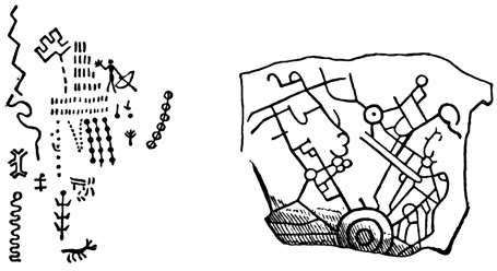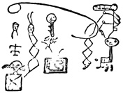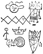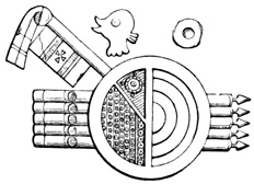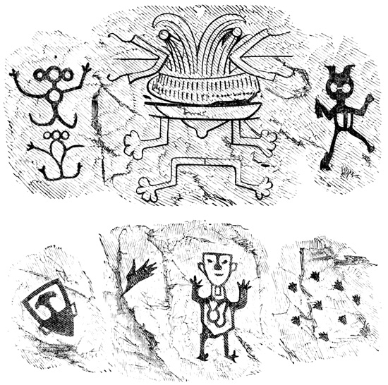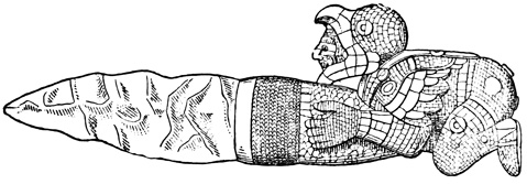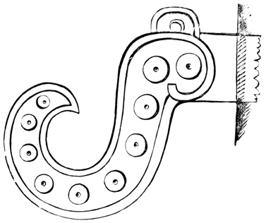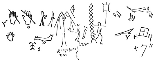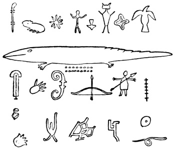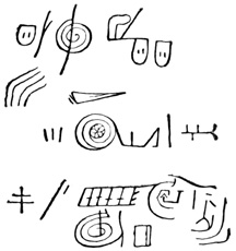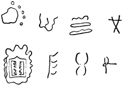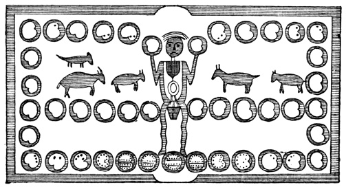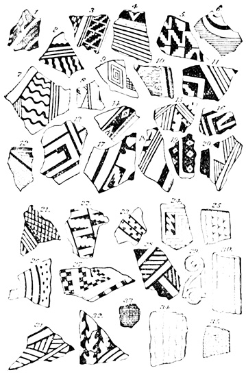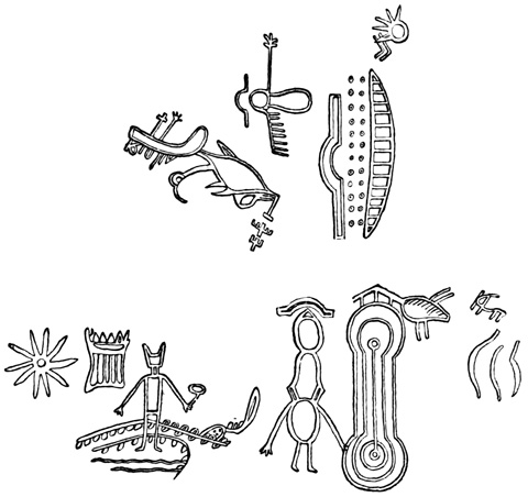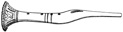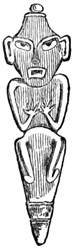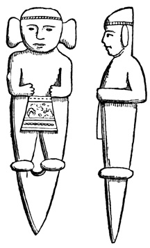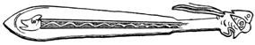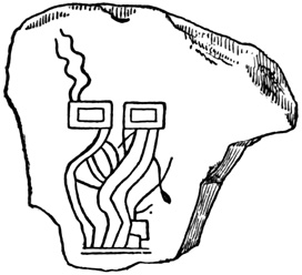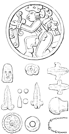 I close my somewhat scanty information concerning the antiquities of Chiriquí with the general remarks which their examination has elicited from different writers. Whiting and Shuman speak of the sculptured 20 columns of Muerto Island as being similar to those in Yucatan described by Stephens;[II-11] but it is hardly probable that this opinion rests on an actual comparison of the hieroglyphics. Dr Merritt deems the axe or chisel heads almost identical in form as well as material with specimens dug up in Suffolk County, England; some of the same implements resemble those seen by Mr Squier in actual use among the natives of other parts of Central America; while the arrow-heads and musical instruments are pronounced different in some respects from any others known, either ancient or modern. The incised characters represented in the cut on page 17, together with many others, if we may believe Mr Seemann, have a striking resemblance to those of Northumberland, England, as shown by Mr Tate.[II-12] In some of the terra cottas, a likeness to vessels of Roman, Grecian, and Etruscan origin has been noted; the golden figures, in the opinion of Messrs Squier and May, being like those found further south in the country of the ancient Muiscas.[II-13]