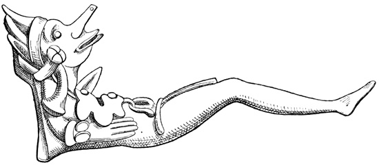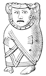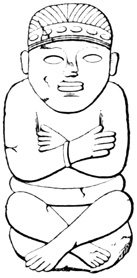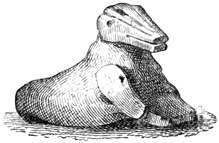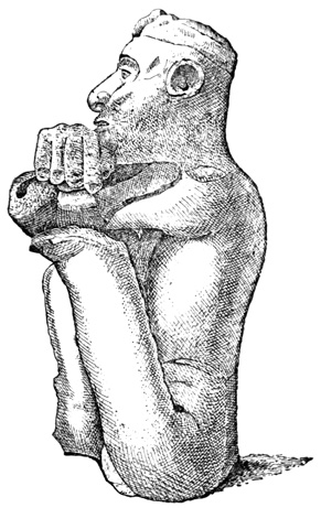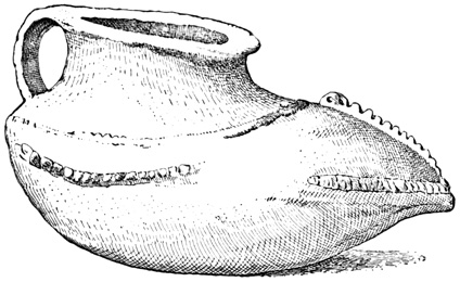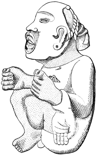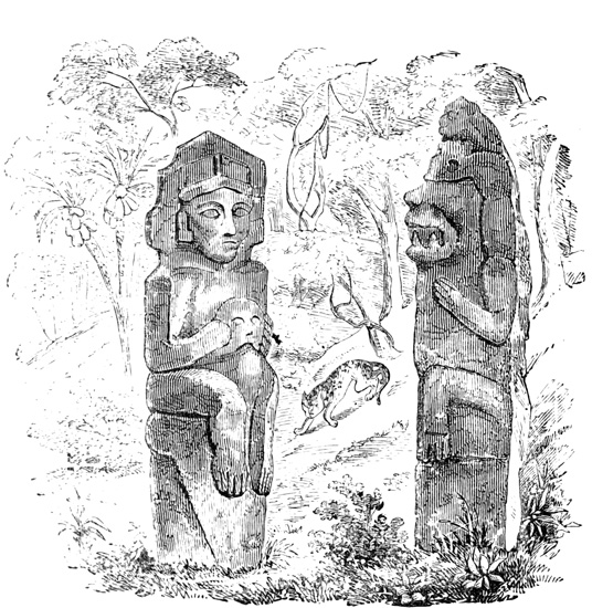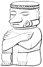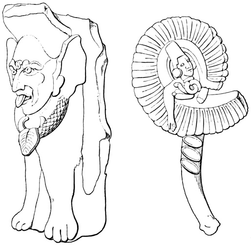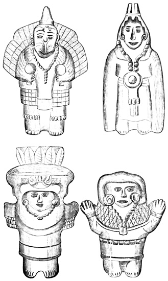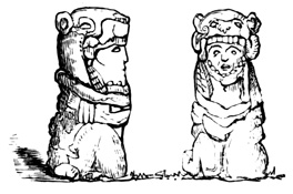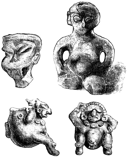 One point bearing on the antiquity of the Chiriquí relics is the wearing away by the weather of the incised sculptures, which appear to Mr Seemann to belong to a more ancient, less advanced civilization than those in low relief.[II-14] Another is the disappearance as a rule of human remains, which, however, as Dr Torrey remarks,[II-15] cannot in this climate and soil be regarded as an indication of great age; and, moreover, against the theory of a remote origin of these relics, and in favor of the supposition that all may be the work of the not distant ancestors of the people found by the Spaniards in possession of the country, we have the fact that gold figures similar to those found in the huacas were made, worn, and traded by 21 the natives of the Isthmus at the time of its discovery and conquest;[II-16] that the animals so universally imitated in all objects whether of gold, stone, or clay, are all native to the country, with no trace of any effort to copy anything foreign; and that similar clay is still employed in the manufacture of rude pottery.[II-17]