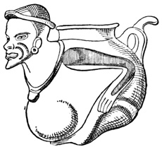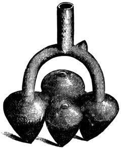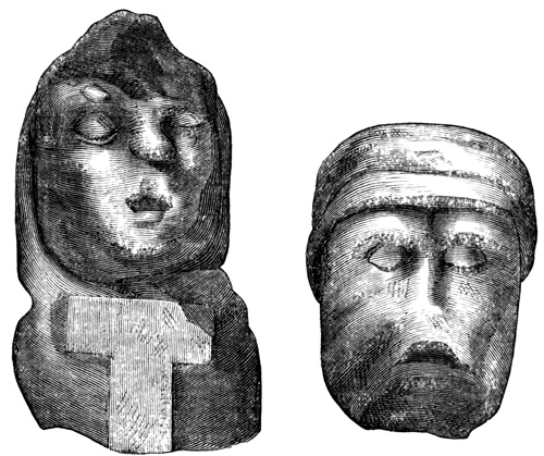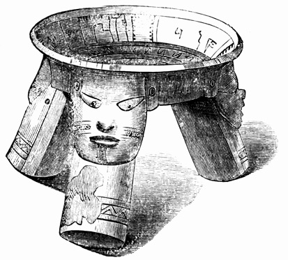 The golden ornaments taken from the huacas of Chiriquí amount to many thousands of dollars in value. They are of small size, never exceeding a few inches in either dimension, are all cast and never soldered, and take the shape of men, animals, or birds. One represents a man holding a bird in each hand, with another on his forehead. The gold is described by Dr Davis as being from ten to twenty carats fine, with some copper alloy; but by another party the alloy is pronounced silver.[II-6] Of stone are found ornaments, such as round agates pierced in the middle; weapons, including axes, chisel-heads, and arrow-heads, the latter of peculiar make, being pyramidal in form, with four cutting edges converging to a point, and in some instances apparently intended to fit loosely into a socket on the shaft; images, perhaps idols, in the shape of animals or men, but these are of comparatively rare occurrence;[II-7] and various articles of unknown use. One of the latter dug up at Bugabita is described as a "horizontal tablet, supported on ornamented legs, and terminating in the head of a monster—all neatly carved from a single stone," being twenty inches long, eight inches high, and weighing twenty-five pounds. Another was conjectured to have served for grinding paints.[II-8] Articles 19 of burned clay are more numerous in the huacas than those of other material. Small vases, jars, and tripods, some of the latter having their three legs hollow and containing small earthen balls which rattle when the vessels are moved, with musical instruments, compose this class of relics. The earthen ware has no indication of the use of the potter's wheel; is found both glazed and unglazed; is painted in various colors, which, however, are not burned in, but are easily rubbed off when moist; and many of the articles are wholly uninjured by time. The specimens, or some part of each, are almost invariably molded to imitate some natural object, and the fashioning is often graceful and true to nature. Perhaps the most remarkable of these earthen specimens, and indeed of all the Chiriquí antiquities, are the musical wind-instruments, or whistles. These are of small dimensions, rarely exceeding four inches in length or diameter, with generally two but sometimes three or four finger-holes, producing from two to six notes of the octave. No two are exactly alike in form, but most take the shape of an animal or man, the mouth-hole being in the tail of the tiger and bird, in the foot of the peccary, in the elbow of the human figure. Some have several air-cavities with corresponding holes to produce the different notes, but in most, the holes lead to one cavity. One had a loose ball in its interior, whose motion varied the sounds. Several are blown like fifes, and nearly all have a hole apparently intended for suspending the instrument by a string.[II-9] Other antiquities are reported to exist at various points of the Isthmus, which white men have never seen; instance a rocking stone in the mountains of Veragua.[II-10]