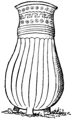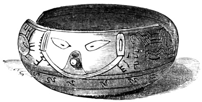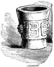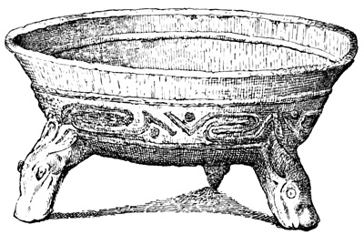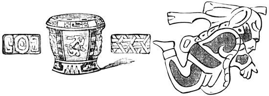 In respect of ancient remains the Mosquito Coast has proved even more barren of results than Costa Rica. A pair of remarkable granite vases preserved in an English museum are said to have come from this region, but as no particulars of their discovery are given, it is of course possible, considering the former unsettled condition of all Central American boundary lines, not altogether remedied in later times, that there may be an error in locality. It is from ten to twelve inches in diameter and height, as nearly as can be ascertained from the drawing, and Humboldt remarks the similarity of its ornamentation to that found on some parts of the ruins of Mitla in Oajaca, 26 described in a future chapter. One of the vases as represented in Humboldt's drawing, is shown in the cut. The second vase is somewhat larger, more nearly uniform in size at top and bottom, with plain legs, only diamond-shaped ornaments on the body of the vessel, and handles which take the form of a head and tail instead of two heads as in the first specimen.[II-26]