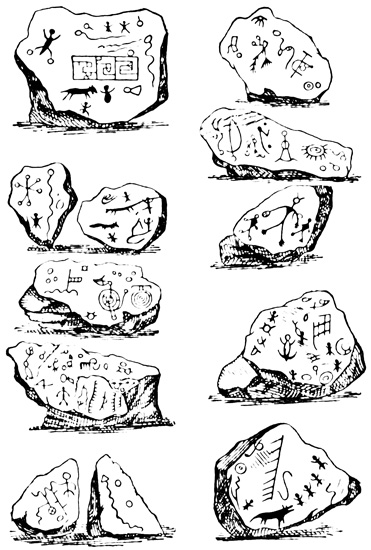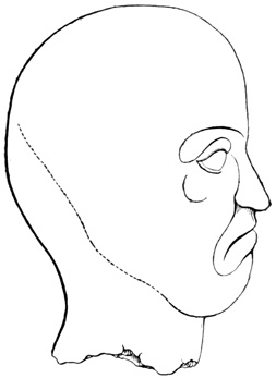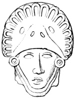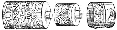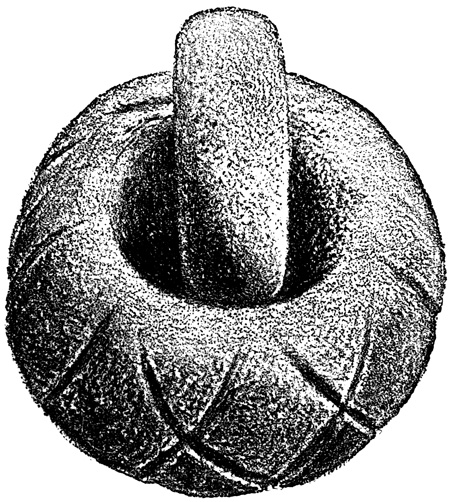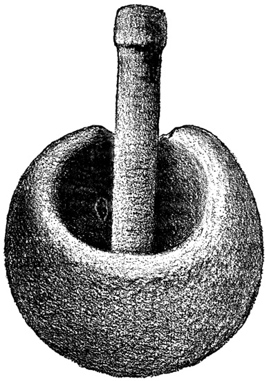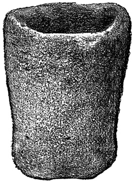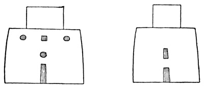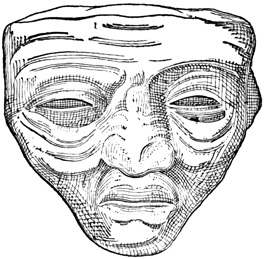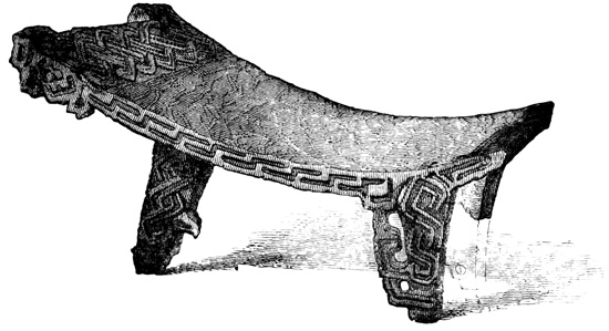 Another lava boulder similarly incised found in the parish of San Miguel is pronounced by Mr Squier, from the examination of a drawing, to resemble stones seen by him in other parts of Central America. I copy Seemann's cuts of several of the characters.[II-4] The second class includes a few stone columns, some of them ten or twelve feet high, found at David and in Veragua as well. These seem never to have been seen in situ, but scattered and sometimes used for building purposes by the present inhabitants. Their peculiarity is that the characters engraved on their surface are entirely different from those of the Piedra Pintal, being smaller and cut in low relief. Drawings of these possibly hieroglyphic signs, by which to compare them with those of Copan, Palenque, and Yucatan, are not extant. The third class comprises the huacas, or tombs, a large number of which have been opened, and a variety of deposited articles brought to light. The tombs themselves are of two kinds. Those of the first kind are mere pebble-heaps, or mounds, three or four feet high, and the only articles taken from them are three-legged stones for grinding corn, known in all Spanish America as metates. The other graves have rude boxes or coffins of flat 18 stones, with, in a few instances, rude stone posts several feet in height. Graves of this class are found to contain golden ornaments, with trinkets and implements of stone and burned clay. In most of them no traces of human remains are met; and when human bones do occur, they usually crumble to dust on exposure to the air, one skull, however, described as broad in the middle and flat behind, having been secured, and a plaster cast exhibited to the American Ethnological Society.[II-5]
