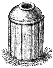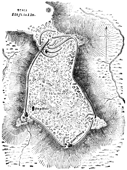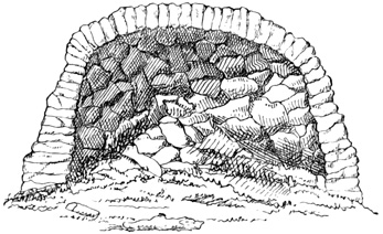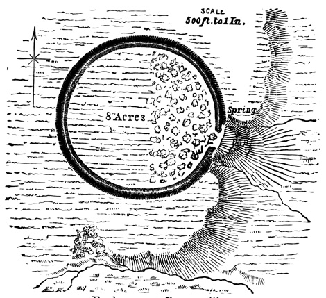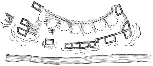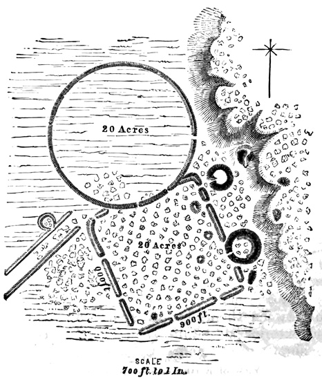 [XII-55] 'In such localities, the general feature of the landscape is very similar to many parts of Devonshire, more especially to that on the eastern escarpment of Dartmoor, and the resemblance is rendered the more striking by the numerous stone circles, which lie scattered around.... These stone circles point to a period in ethnological history, which has no longer a place in the memory of man. Scattered in irregular groups of from three or four, to fifty or more, these stone circles are found, crowning the rounded promontories over all the South Eastern end of the Island. Their dimensions vary in diameter from three to eighteen feet; of some, only a simple ring of stones marking the outline now remains. In other instances the circle is not only complete in outline, but is filled in, built up as it were, to a height of three to four feet, with masses of rock and loose stones, collected from amongst the numerous erratic boulders, which cover the surface of the country, and from the gravel of the boulder drift which fills up many of the hollows. These structures are of considerable antiquity, and whatever they may have been intended for, have been long disused, for, through the centre of many, the pine, the oak, and the arbutus have shot up and attained considerable dimensions—a full growth. The Indians when questioned, can give no further account of the matter, than that, "it belonged to the old people," and an examination, by taking some of the largest circles to pieces, and digging beneath, throws no light on the subject. The only explanation to be found, is in the hypothesis, that these were the dwellings of former tribes, who have either entirely disappeared, or whose descendants have changed their mode of living, and this supposition is strengthened by the fact that a certain tribe on the Fraser River, did, till very recently live, in circular beehive shaped houses, built of loose stones, having an aperture in the arched roof for entrance and exit, and that in some localities in upper California the same remains are found, and the same origin assigned to them.' Forbes' Vanc. Isl., p. 3.