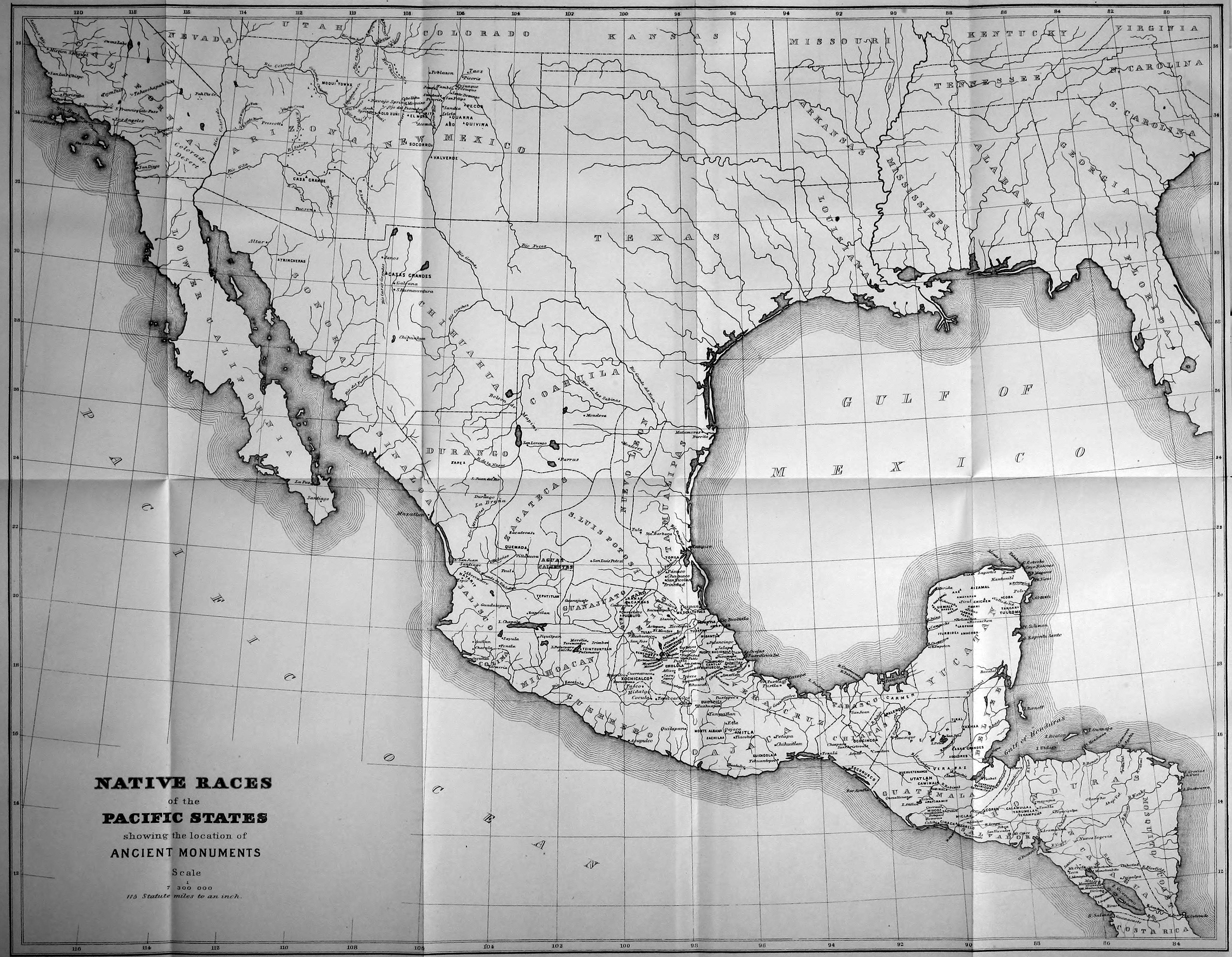 Costa Rica, adjoining Chiriquí on the west, is the first or most southern of the states which belong politically to North America, all the Isthmus provinces forming a part of Colombia, a state of the southern continent. Stretching from ocean to ocean with an average width of ninety miles, it extends north-westward in general terms some two hundred miles from the Boca del Drago and Golfo Dulce to the Rio de San Juan and the southern shores of Lake Nicaragua in 11° north latitude. Few as are the aboriginal monuments reported to exist within these limits, still fewer are those actually examined by travelers.
