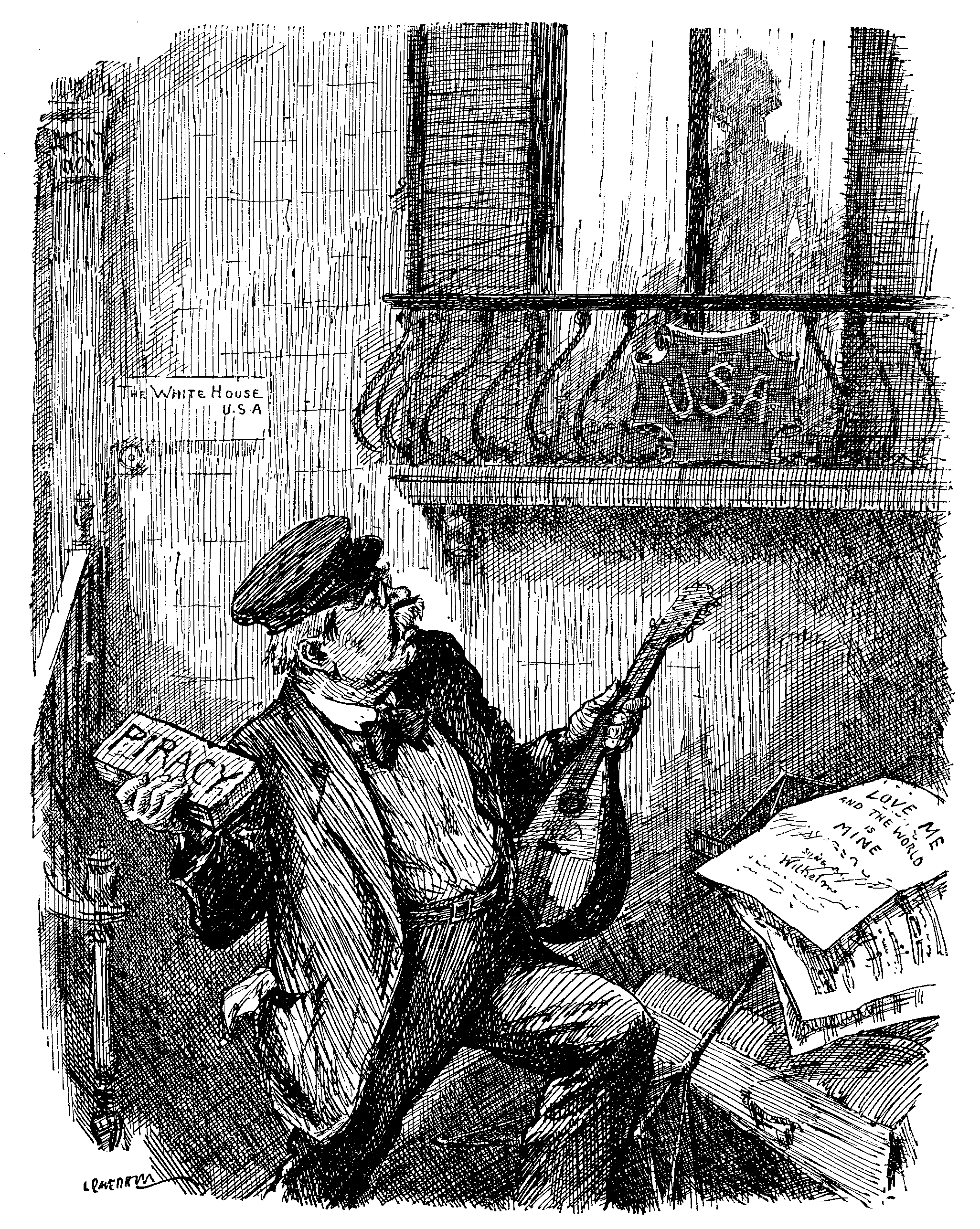 Teuton Troubadour (serenading the fair Columbia). "IF SHE WON'T LISTEN TO MY LOVE-SONGS, I'LL TRY HER WITH A BRICK!"