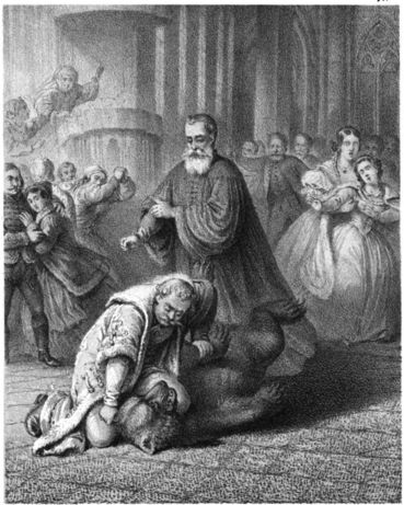 Vilmos herczeg reszketve emelte föl arczát; szép nemes vonásaira visszatért a nyugalom. A nemes elhatározás, a mely nagy lelkek sajátja, olvasható volt homlokán. Odafordult a bájoló menyasszonyhoz: „csak egy csókot, csak egy könyet“ rebegé megtört lélekkel. Hedvig oda nyujtá a forró ajk elé hófehér kezét, s a köny ott ragyogott szemében.