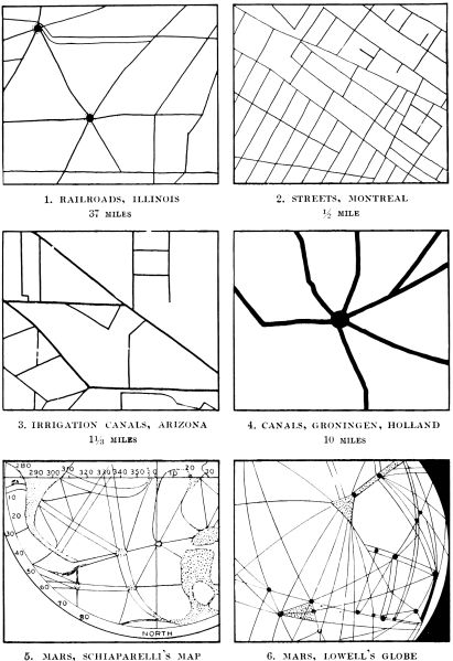 In this broad way only can we form a dim conception of the overwhelming distances of space, and, in this absolutely unthinkable space, our little Sun, with its constant rain of meteoric dust, an occasional comet, and its microscopic planets are literally bunched together. To admit, as we must then, that one of these motes has had irrigating canals on various parts of its surface since prehistoric times, and the other mote has nothing of the sort despite the geodetic lines13 that are seen marking its surface, is simply preposterous. Their disposition, their visibility coincident with the Martian summer, becoming apparent only when the snow caps melt, their convergence towards centres of distribution, all go to prove by the simplest analogy an identity of structure. Certainly the overwhelming force of Lowell's observations and arguments baffles any other reasonable explanation of the character and purpose of these markings. Here are the lines, some following the arcs of great circles, all appearing precisely when they should appear, and in progressive strength from the north when the vivifying water from the melting snow cap first starts the vegetation. Why certain parallels or doublings are observed in some of the canals is about as puzzling to us as the checkerboard townships of the West would appear to a Martian, where some would be yellow with the ripening grain while others, uncultivated, would appear of a different color.