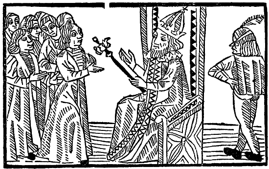 | Comment le roy charles et rolant sont par l'acteur reprins et excusez aulcunement sur le debat devant dit. | Le .v. chapitre. |