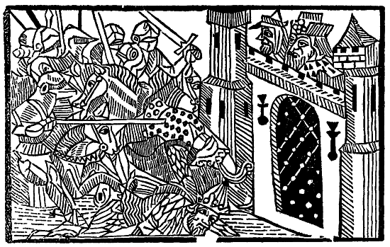 | Comment les pers de france furent asaillis plus fort que jamais et la tour quasi mise par terre et reconfortés par les saintes reliques par eulx adorees et aultres matieres. | Le .x. chapitre. |