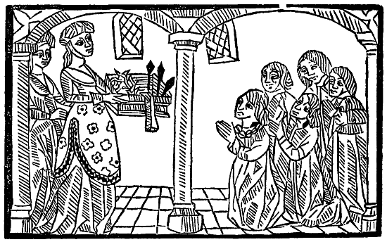| Comment par le moyen de floripes tous les françoys furent saulvez et logés ensemble congneuz de par elle et araisonnez et les reliques monstrees devant eulx et aultres matieres. | Le .ix. chapitre. |