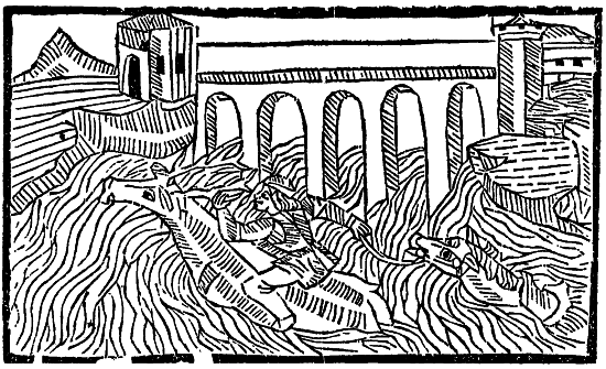 | Du pont merveilleux de mantrible. et du tribut qu'il y falloit paier pour le passage. et comment a belles parolles les françoys passerent oultre. | Le .vii. chapitre. |