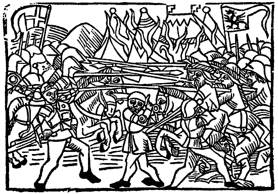 | Comment les payens proposerent de pendre Guy de bourgoigne voyans les françoys qui le secoururent puissamment. | Le .xv. chapitre. |