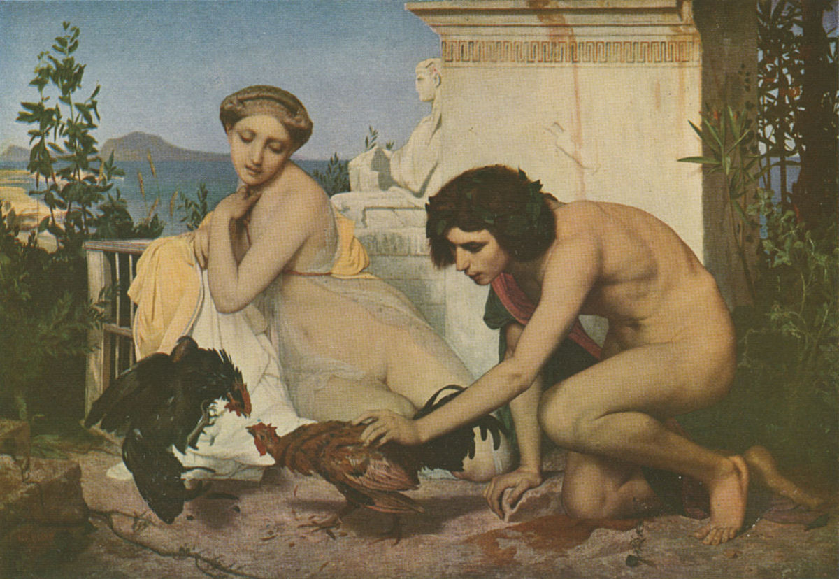 This was Gérôme's first picture. It was exhibited at the Salon of 1847, and achieved a brilliant success. Théophile Gautier, who was a critic hard to please, bestowed upon it some enviable praise. In later years the artist found much to censure in his early work; but the public, less severely critical, admired the graceful nudity of the young forms and the combative ardour of the two adversaries.