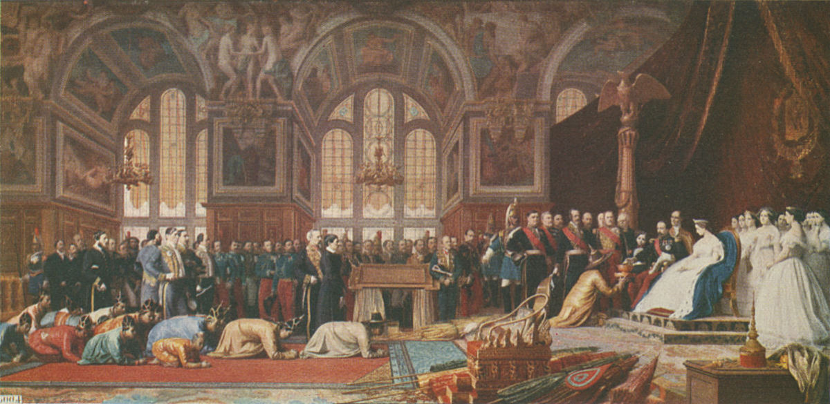 This picture possesses a curious interest because it shows in what a picturesque manner Gérôme could execute a painting officially ordered. He received the commission in 1865, through the Imperial Household. He has rendered with much felicity all the pompous and highly coloured aspect of the scene, very effective in the sumptuous setting of the Salle des Fêtes at Fontainebleau.