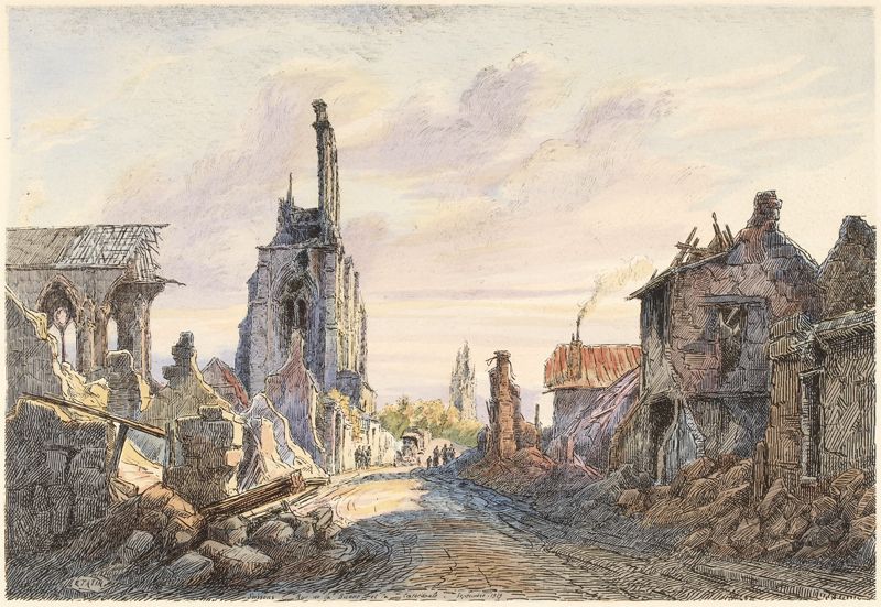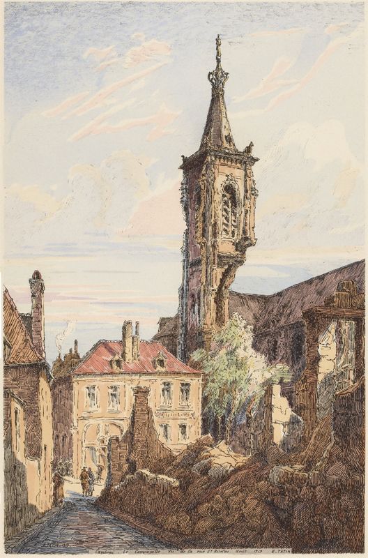 A l'arrière-plan, et dominant à l'extrême horizon ce chaos, surgissent les deux flèches de Saint-Jean-des-Vignes que de nombreux projectiles ont atteint sans le défigurer, mais en lui laissant de ces cicatrices profondes qui sont la marque même du Germain.