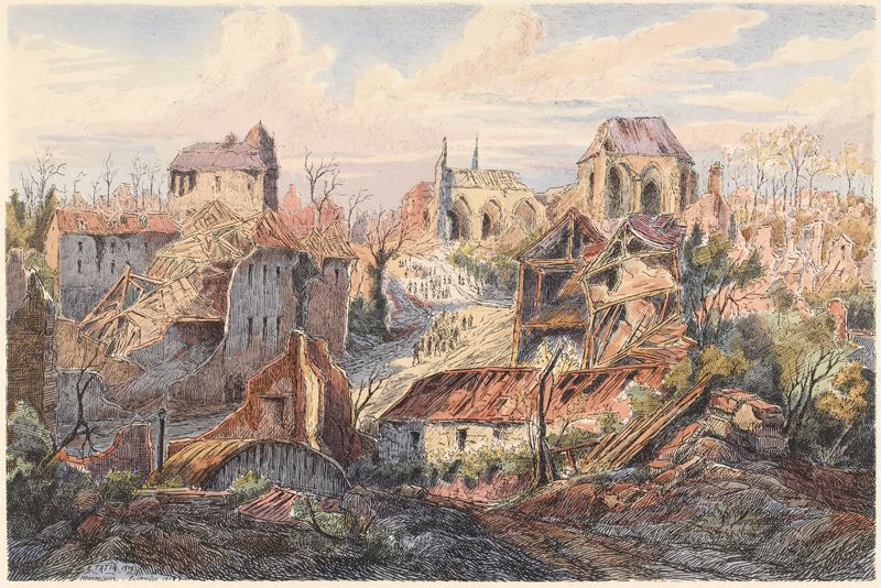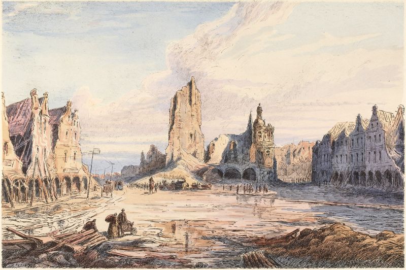 Du charmant hôtel de ville et de son porche voûté d'ogives, il ne reste qu'un informe squelette sur lequel s'est écrasé son élégant campanile. Sur ces décombres, l'ennemi avait placardé l'inscription suivante qui voulait sans doute être spirituelle: «Nicht ärgern. Nur wundern. (Ne pas s'irriter, mais seulement admirer.)» Or, bien plutôt que la manifestation de la force brutale, ce qu'il convient d'admirer ici, c'est le réveil de l'activité. Quelques habitants sont revenus que l'on voit s'approvisionnant aux boutiques improvisées en un coin de la place. Singulier contraste que celui de la vie qui s'acharne à se réimplanter dans cette désolation de mort, et que l'on retrouve partout aussi énergique et frappant!