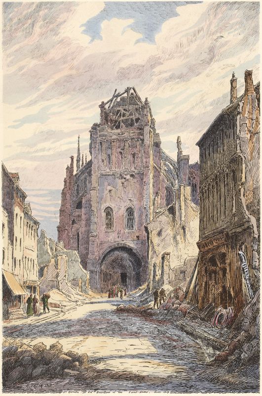 Meurtrie aussi et combien défigurée, l'antique collégiale gothique qui passe à tort ou à raison pour être au moins en partie l'œuvre de Vilard de Honnecourt! Sa masse émerge à l'extrémité de la rue Saint-André, elle-même bordée de décombres.