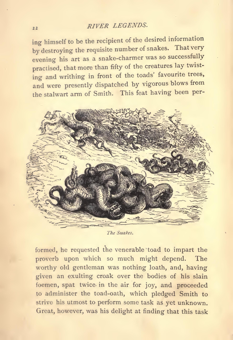 Smith listened with great attention to the remarks made by his ancient friend, and lost no time in qualifying 022himself to be the recipient of the desired information by destroying the requisite number of snakes. That very evening his art as a snake-charmer was so successfully practised, that more than fifty of the creatures lay twisting and writhing in front of the toads’ favourite trees, and were presently dispatched by vigorous blows from the stalwart arm of Smith.