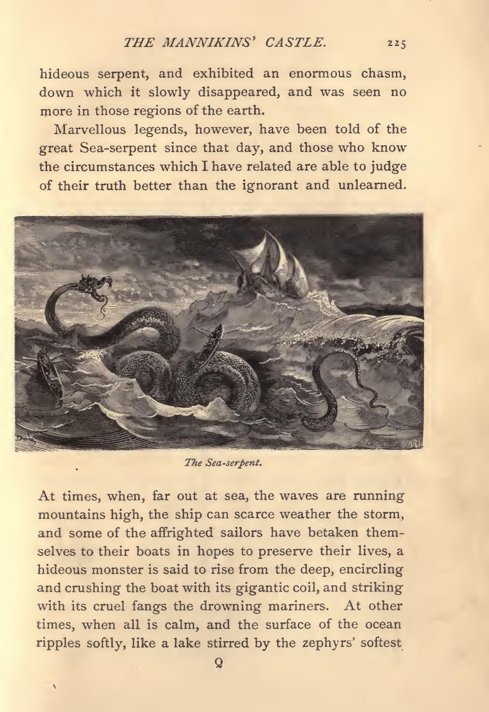 At times, when, far out at sea, the waves are running mountains high, the ship can scarce weather the storm, and some of the affrighted sailors have betaken themselves to their boats in hopes to preserve their lives, a hideous monster is said to rise from the deep, encircling and crushing the boat with its gigantic coil, and striking with its cruel fangs the drowning mariners. At other times, when all is calm, and the surface of the ocean ripples softly, like a lake stirred by the zephyrs’ softest breath, 226a huge and awful form may be seen floating on the waves, slowly making its way through the waters, and ever and anon raising its hideous serpent-head aloft, as if in search of something to injure or destroy. Wonderful tales do the sailor men bring home of this extraordinary creature, and wise folk oftentimes shake their heads and affect to disbelieve in its existence. But we, Brother Rhine, who know this chronicle of early days which I have just been telling, shake no heads over the matter, and entertain no doubt of the reality of the sight which the sons of Neptune aver that they have seen. Old Goody Tickleback is the great Sea-serpent, and my only wonder is that, when the great owl-fairy was about it, he did not put her out of the way altogether, instead of leaving her in a position in which she could still work so much mischief to mortal men. I suppose, however, that fairies, like other people, know their own business best; and there was probably some reason against this self-evidently wise course which does not occur to those who do not happen themselves to be fairies.