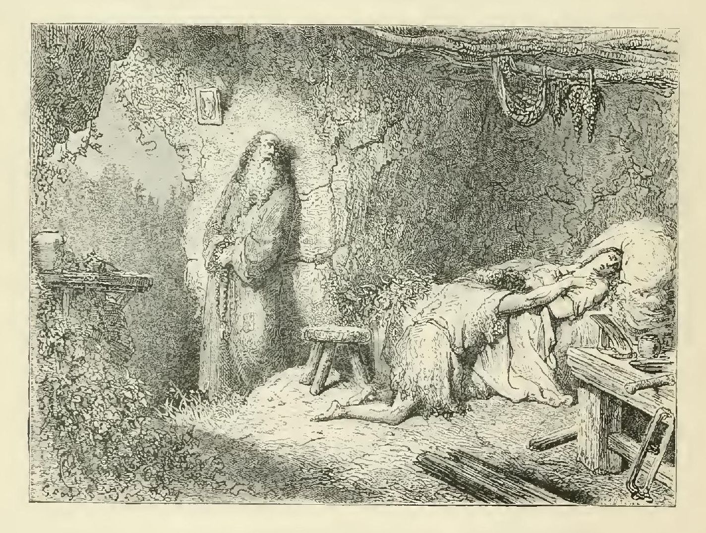 The illustrations of M. Doré have given an additional value to this tale, so simple, so unsophisticated, yet blooming with all the wild luxuriance of nature. The artist has added his gifts to those of the poet; and those acquainted only with his ready and original powers as the delineator of farce and drollery, or of the exceptionally tragic and horrible, will find new cause for admiration in these quiet renderings of the primeval beauties of the American wild—its plains and forests, its still lagoons and roaring cataracts, its mountain slopes and deep defiles—all its aspects of rudest workmanship—and will welcome these efforts of his genius in the lovely realm of descriptive art, wedded as they are to the exquisite simplicity of this Indian romance. As in his other works, here may be noted the same surpassing fertility of resource, the same alertness of intellect and readiness and swiftness of touch; but there may also be found new proofs of his complete sympathy with all that is picturesque in forest beauty and his high intuitive perception of every possible phase of nature in her wildest caprice and most tender bloom.