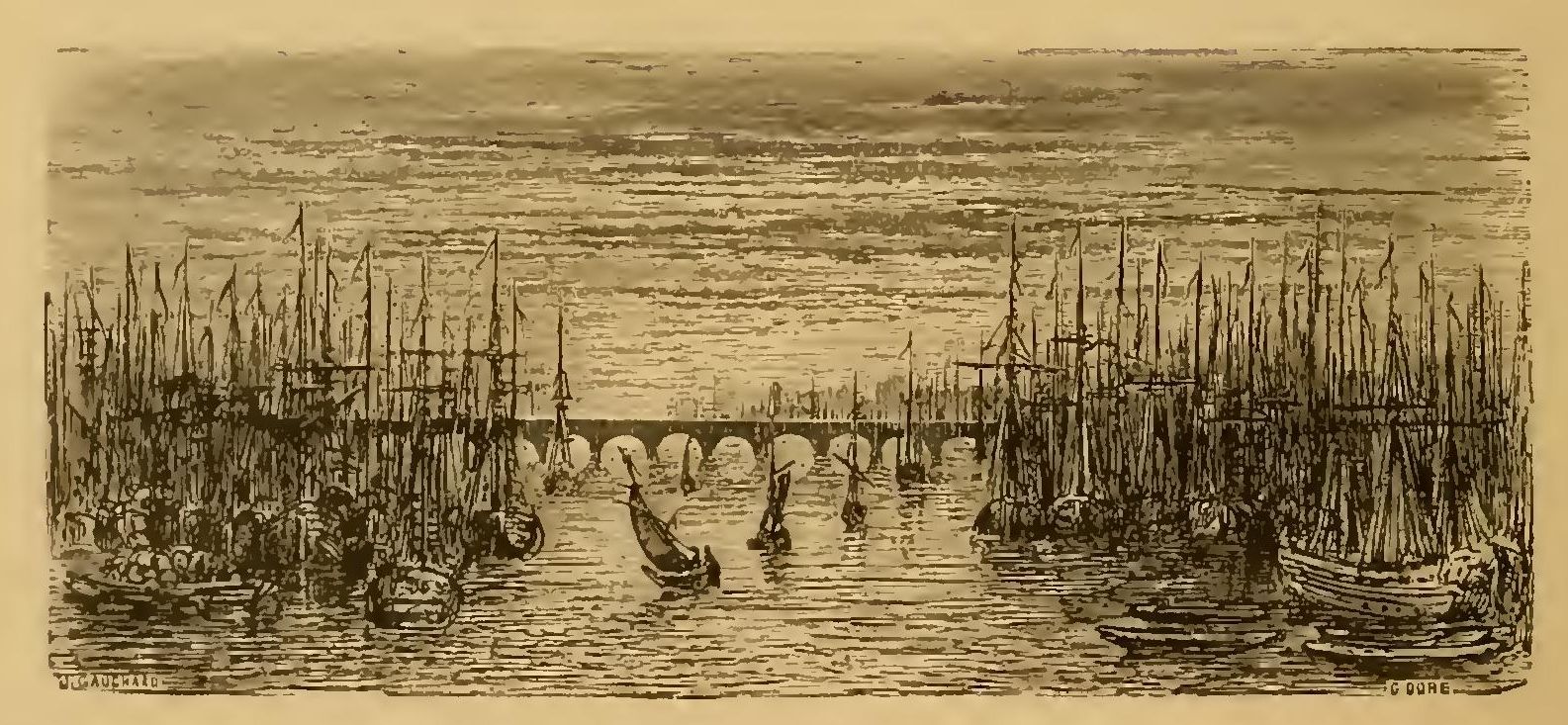 The next evening, a fresh sea-breeze has brought us to Bordeaux. The enormous city heaps its monumental houses along the river like bastions; the red sky is embattled by their coping. They on one hand, the bridge on the other, protect, with a double line, the port where the vessels [011]are crowded together like a flock of gulls; those graceful hulls, those tapering masts, those sails swollen or floating, weave the labyrinth of their movements and forms upon the magnificent purple of the sunset. The sun sinks down into the midst of the river and sets it all ablaze; the black rigging, the round hulls, stand out against its conflagration, and look like jewels of jet set in gold. [012]