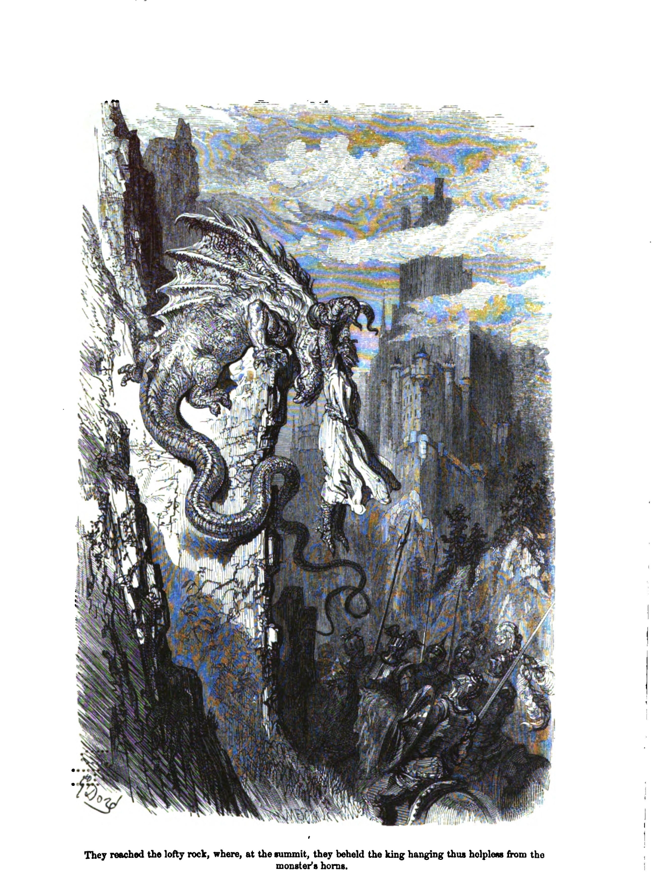 The monster still kept on its even way, not seeming to remark the knights, until a rock it reached, lofty and round and high. It scaled it, as a swallow, rapidly; and Gawain and his friends, who at a distance followed, sad and full of thought, saw it, when thus the summit was attained, crawl straight towards a peak which overhung. There, stretching out its head, it held the king suspended o'er the abyss. Judge the alarm of Gawain and his friends, who each beside was almost wild with rage! Hearing their cries, they who remained behind came up full spur, and reached the lofty rock, where, at the summit, they beheld the king hanging thus helpless from the monster's horns. They then gave loose to the most doleful cries that ever had been heard. I cannot picture to you their despair. Brave knights and pages then you might have 024seen tearing their hair and rending their attire, that wood reviling and the strange adventure which they had come to seek. And Quex exclaimed, by way of final stroke: