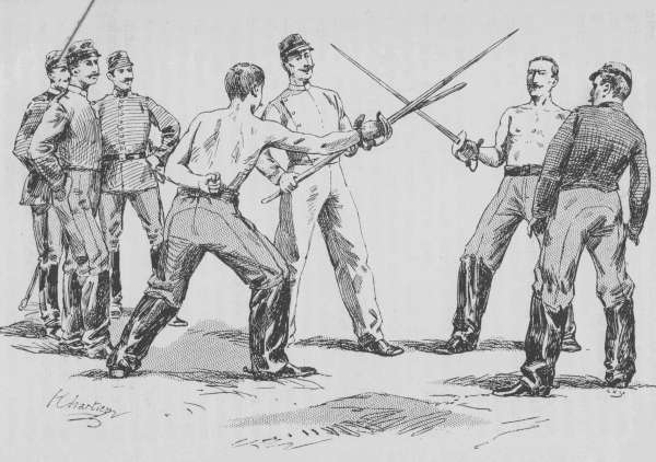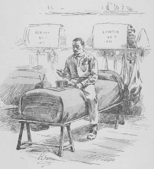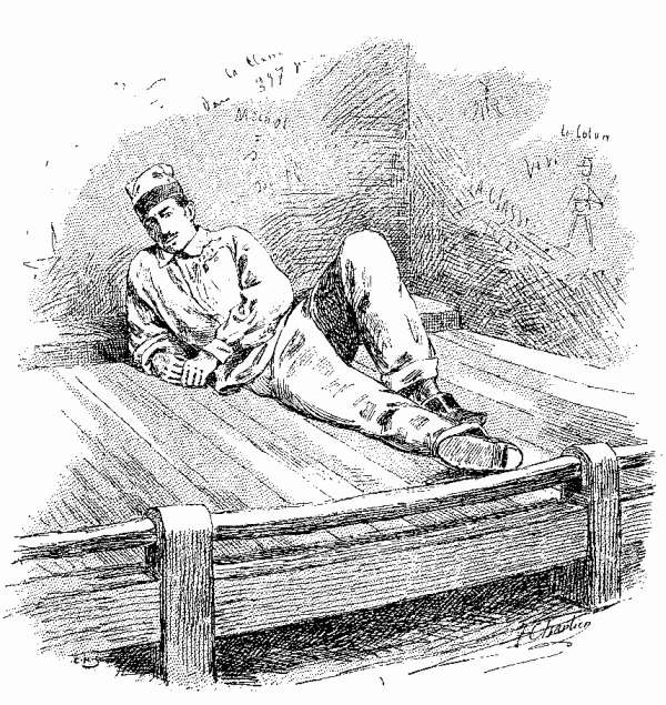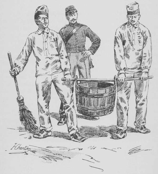 In the case of a nation which possesses no public schools like the great institutions of England, I believe that compulsory military service might be made an excellent moral and physical training for young men in every rank of life. But the French system is vicious. A system in which gentlemen of refinement and the vilest dregs of the city slums are subjected to identical treatment, and ruled by identical measures of discipline, is an impossible one. Take punishments, for instance. "Equality of punishment" may sound well in theory, but in practice it becomes the rankest inequality. A gentleman accustomed to comfort, or perhaps luxury, is for the slightest fault sent to the Salle de Police to endure the degrading horrors presently to be described—his companions are perhaps roughs who have never slept in a bed since they were children, to whom dirt is a mere necessary condition, and vermin are "familiar beasts."