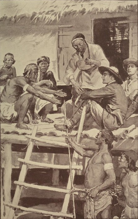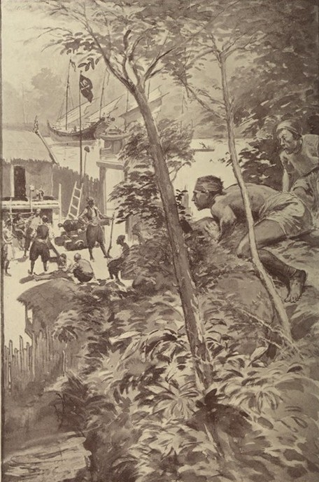 Once more Captain John Richardson became absorbed in thought, and, leaning back against the old oak beam which supported the porch, became lost to his surroundings. So lost indeed that he failed to hear the creak of the wicket, while his dim eye failed to see the youth who came striding [Pg 13]towards him. But a moment later, catching sight of the figure screened amidst the creepers in the porch, the young fellow gave vent to a shout which thoroughly awakened the sailor.