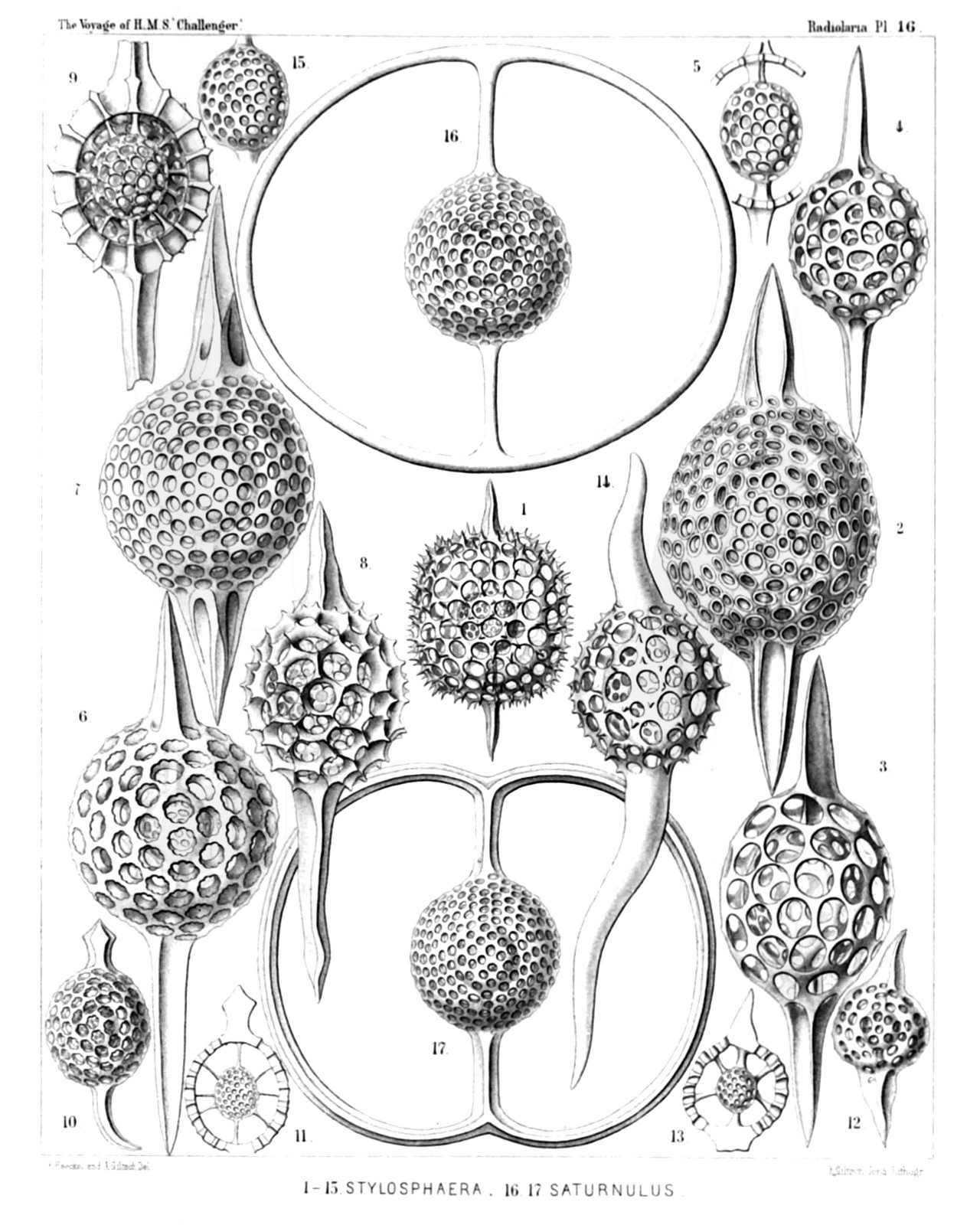 | The central capsule is filled up by clear vacuoles and contains on its cortical zone a layer of large oil-globules. The central nucleus contains numerous dark nucleoli. The calymma is radially striped, contains numerous small xanthellæ, and is surrounded by the spicula. | |||