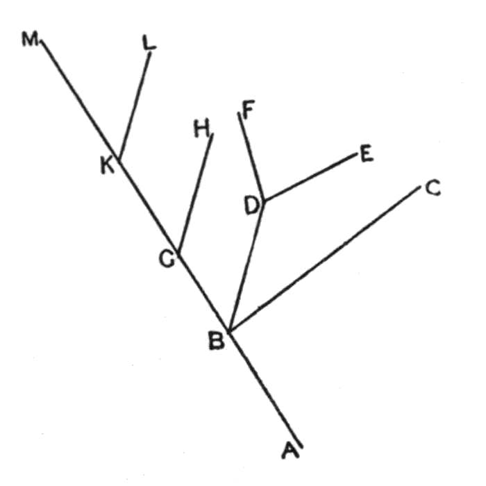 Divergence of Character.—As there are so many different places and conditions in the economy of nature which can be occupied by organic beings differently constituted, individuals which diverged most from the original type would be brought into less severe competition, than those which diverged only in a slight degree. For instance, if we represent the original form as A, occupying one place in the economy of nature; a second form as B, occupying a somewhat similar place; a third form as C, occupying a very different place to A although somewhat similar place to B, it is obvious that B would enter into severe competition with both A and C, whilst A and C might not trend to any great extent on one another's place in the natural economy; hence B would be exterminated before either A or C. In other words, natural selection continually tends to increase the slight differences, which we call varieties, into the greater differences, which we call species.