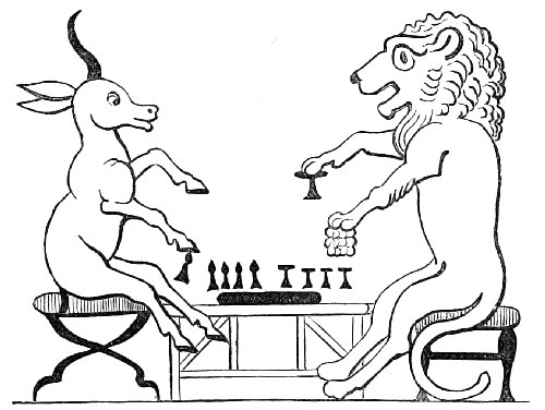 The practice having been once introduced of representing men under the character of animals, was soon developed into other applications of the same idea—such as that of figuring animals employed in the various occupations of mankind, and that of reversing the position of man and the inferior animals, and representing the latter as treating their human tyrant in the same manner as they are usually treated by him. The latter idea became a very favourite one at a later period, but the other is met with not unfrequently among the works of art which have been saved from the wrecks of antiquity. Among the treasures of the British Museum, there is a long Egyptian picture on papyrus, originally forming a roll, consisting of representations of this description, from which I give three curious examples. The first (see cut No. 4) represents a cat in charge of a drove of geese. It will be observed that the cat holds in her hand the same sort of rod, with a hook at the end, with which the monkeys are furnished in the preceding picture. The second (No. 5) represents a fox carrying a basket by means of a pole supported on his shoulder (a method of carrying burthens frequently represented on the monuments of ancient art), and playing on the well-known double flute, or pipe. The fox soon became a favourite personage in this class of caricatures, and we know what a prominent part he afterwards played in mediæval satire. Perhaps, however, the most popular of all animals in this class of drolleries was the monkey, which appears natural enough when we consider its singular aptitude to mimic the actions of man. The ancient naturalists tell us some curious, though not very credible, stories of the manner in which this characteristic of the monkey tribes was taken advantage of to entrap them, and Pliny (Hist. Nat. lib. viii. c. 80) quotes an older writer, who asserted that they had even been taught to play at draughts. Our third subject from the Egyptian papyrus of the British Museum (No. 6) represents a scene in which the game of draughts—or, more properly speaking, the game which the Romans called the ludus latrunculorum, and which is believed to have resembled our draughts—is played by two animals well known to modern heraldry, the lion and the unicorn. The lion has evidently gained the victory, and is fingering the money; and his bold air of swaggering superiority, as well as the look of surprise and disappointment of his vanquished opponent, are by no means ill pictured. This series of caricatures, though Egyptian, belongs to the Roman period.