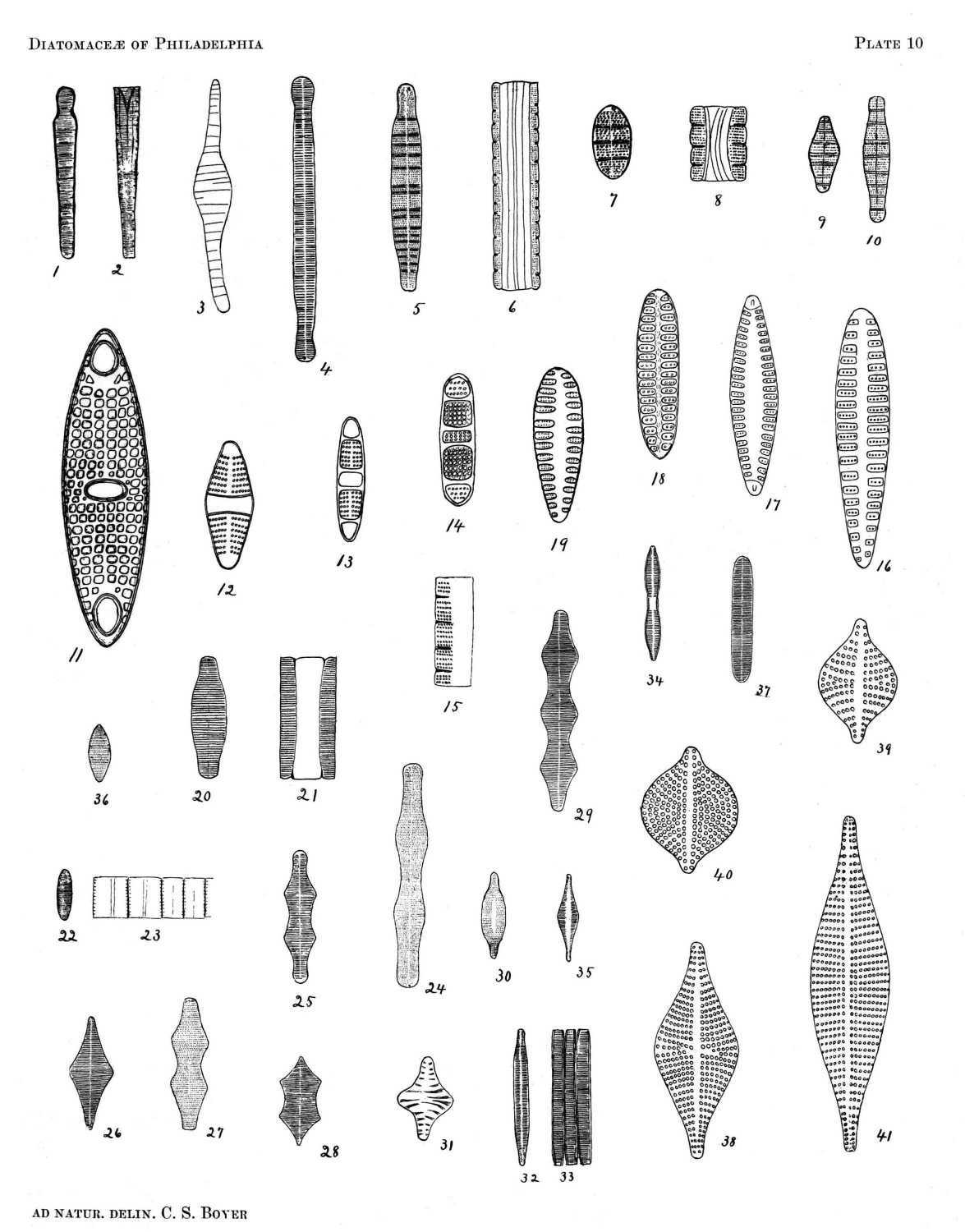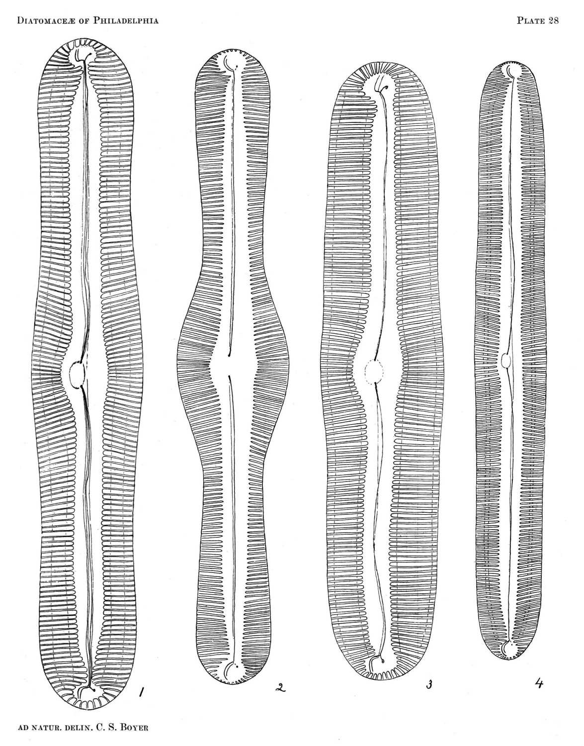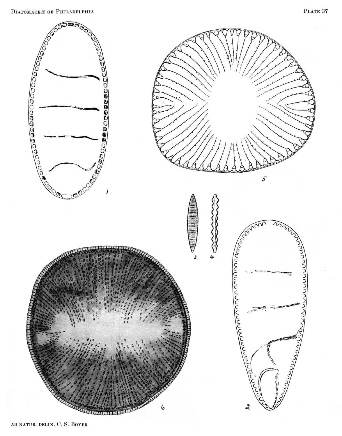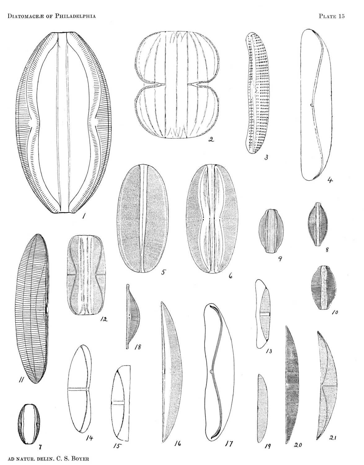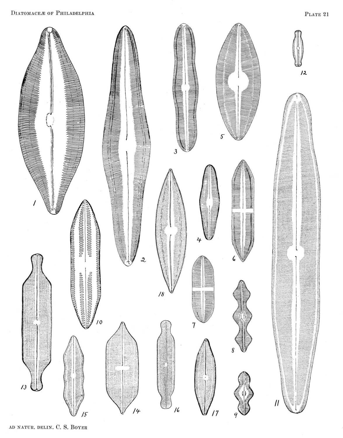 The city of Philadelphia, about one hundred miles from the sea, lies at the junction of the Schuylkill with the Delaware, and much of the land near the rivers, especially southward, is flat and low, composed of recent alluvial deposits. In the central districts the ground is high, the deep sub-soil being mostly a dry gravel resting upon gneiss and schist, although it is in part composed of a bluish clay which was probably laid down in the bed of the ancient river before the last period of the glacial drift. The blue clay was not all deposited at the same time, as in the lower strata many marine forms are found which do not occur in the upper layers. This is notably the case in a deposit obtained at Spreckel's Sugar Refinery and also at the east end of Walnut Street Bridge, where a layer of blue clay occurs which is overlain by glacial drift. In other parts of the city mixtures of blue clay with more recent deposits are found, including fresh-water forms from numerous creeks and rivulets which traversed what is now the city proper, and especially from the vicinity of Fourth and Market Streets, where there existed as late as the year 1700 a large pond known as the "Duck Pond" which was subject to tidal overflow from its outlet, Dock Creek. The river water at Philadelphia is not noticeably brackish, although the tide extends thirty miles above the city and, before the building of Fairmount Dam, to the Falls of the Schuylkill. At certain times, when the river is low, the influx of tide water is sufficient to produce an abundance of brackish water diatoms at Greenwich Point. The entire absence, however, at present, of many of the marine forms obtained in dredgings in the Delaware opposite the city, as at Smith's Island, now removed, and in certain well borings at Pavonia, Pensauken, Gloucester and other places in New Jersey, where the depth reached the old blue clay, indicates conditions quite different from those now prevalent. In the Bay itself comparatively few living species are found, at least in any abundance.