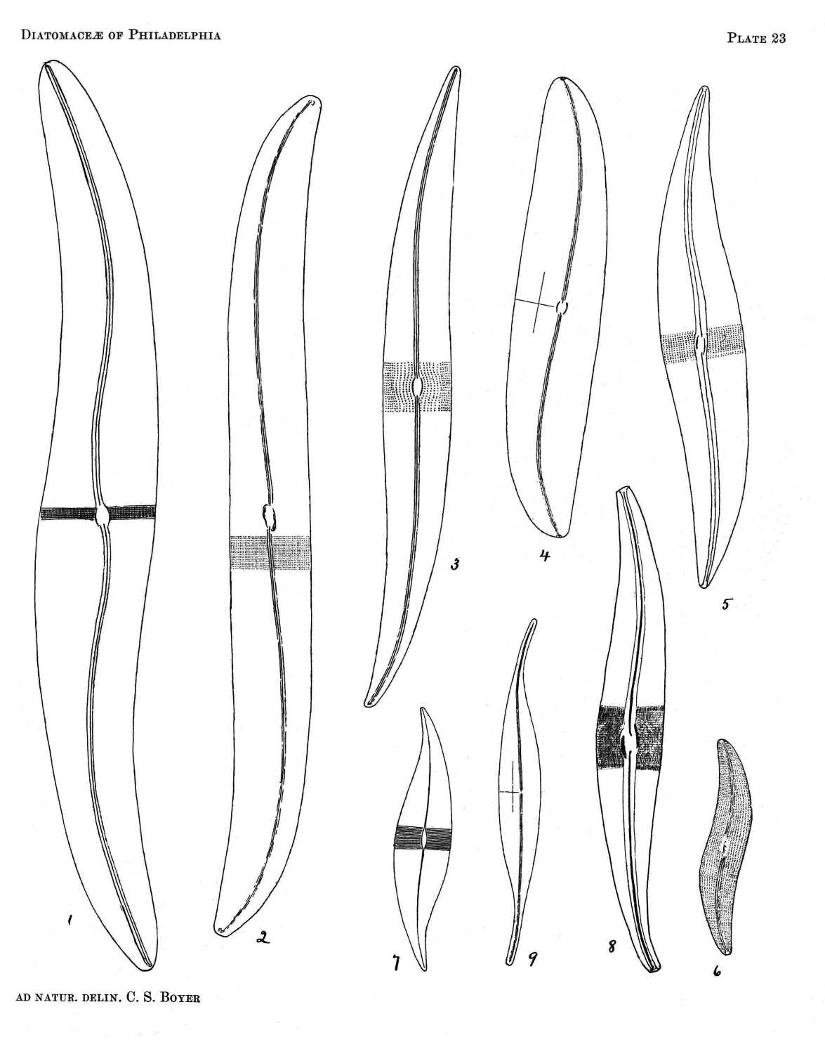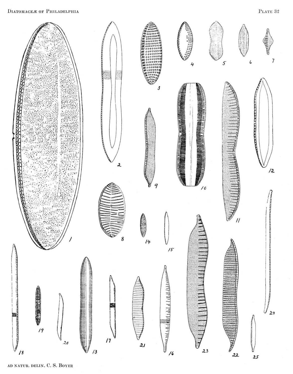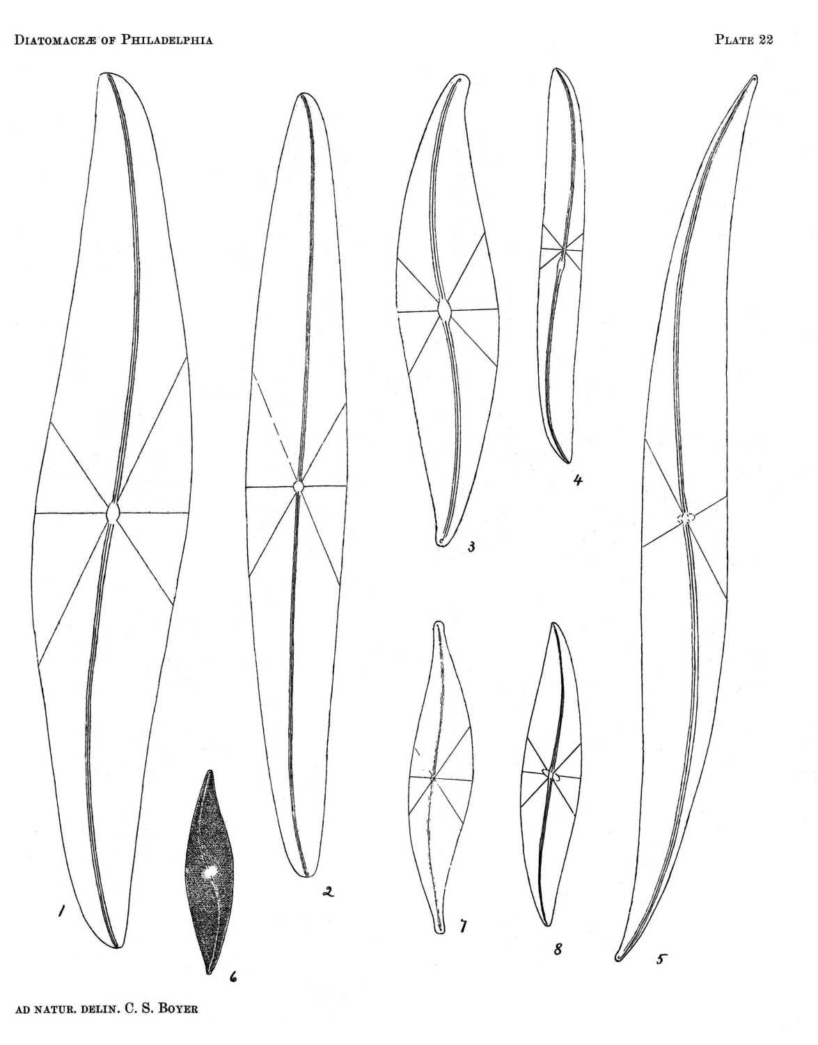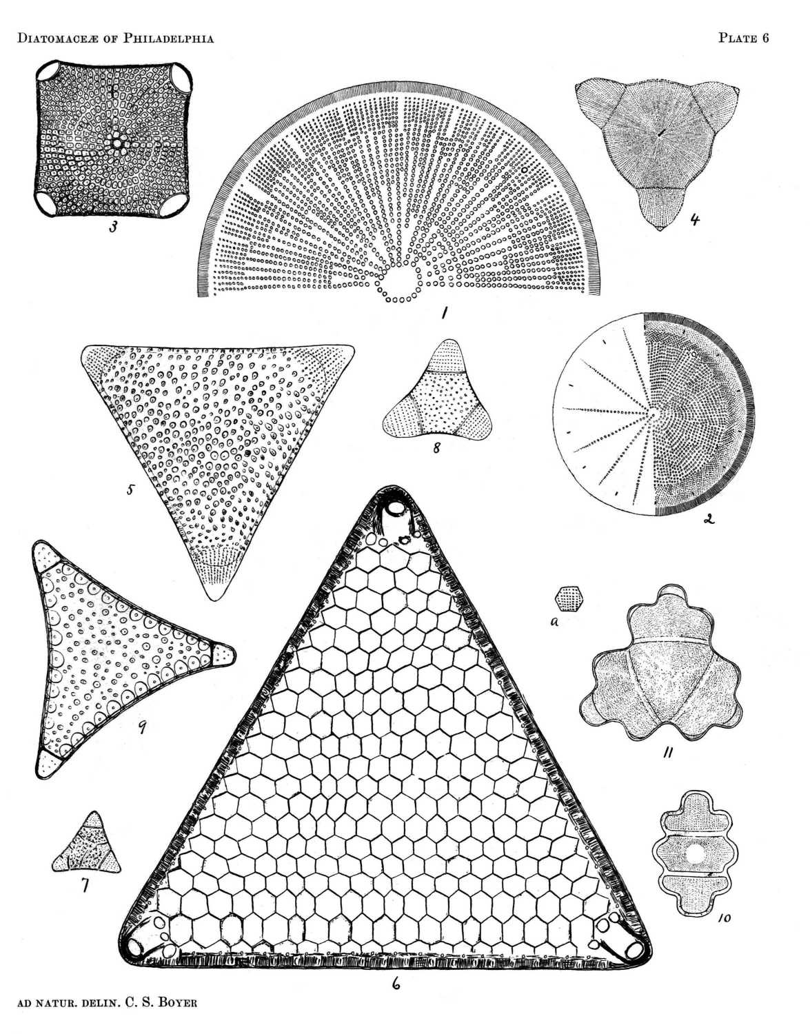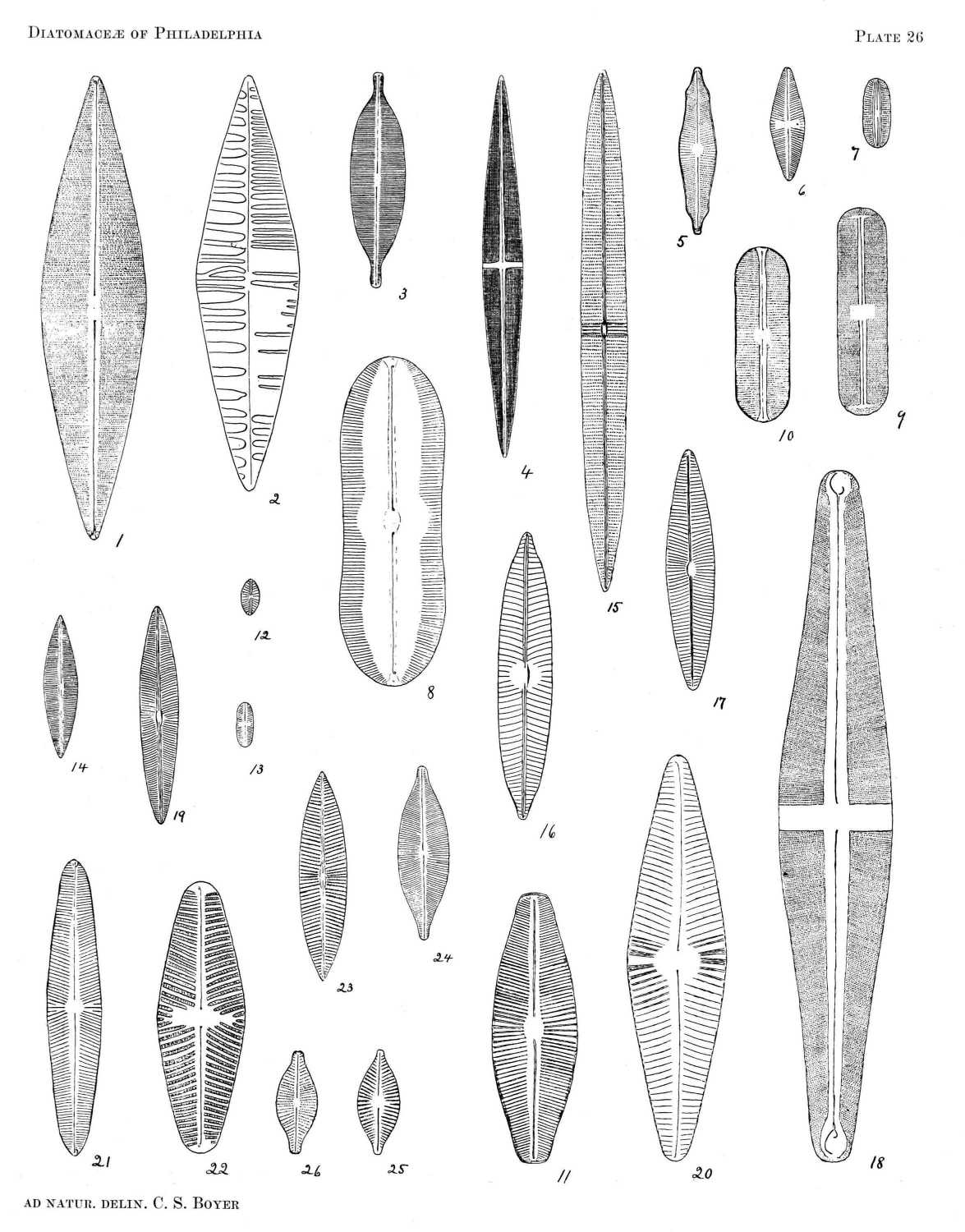 The city of Philadelphia, about one hundred miles from the sea, lies at the junction of the Schuylkill with the Delaware, and much of the land near the rivers, especially southward, is flat and low, composed of recent alluvial deposits. In the central districts the ground is high, the deep sub-soil being mostly a dry gravel resting upon gneiss and schist, although it is in part composed of a bluish clay which was probably laid down in the bed of the ancient river before the last period of the glacial drift. The blue clay was not all deposited at the same time, as in the lower strata many marine forms are found which do not occur in the upper layers. This is notably the case in a deposit obtained at Spreckel's Sugar Refinery and also at the east end of Walnut Street Bridge, where a layer of blue clay occurs which is overlain by glacial drift. In other parts of the city mixtures of blue clay with more recent deposits are found, including fresh-water forms from numerous creeks and rivulets which traversed what is now the city proper, and especially from the vicinity of Fourth and Market Streets, where there existed as late as the year 1700 a large pond known as the "Duck Pond" which was subject to tidal overflow from its outlet, Dock Creek. The river water at Philadelphia is not noticeably brackish, although the tide extends thirty miles above the city and, before the building of Fairmount Dam, to the Falls of the Schuylkill. At certain times, when the river is low, the influx of tide water is sufficient to produce an abundance of brackish water diatoms at Greenwich Point. The entire absence, however, at present, of many of the marine forms obtained in dredgings in the Delaware opposite the city, as at Smith's Island, now removed, and in certain well borings at Pavonia, Pensauken, Gloucester and other places in New Jersey, where the depth reached the old blue clay, indicates conditions quite different from those now prevalent. In the Bay itself comparatively few living species are found, at least in any abundance.