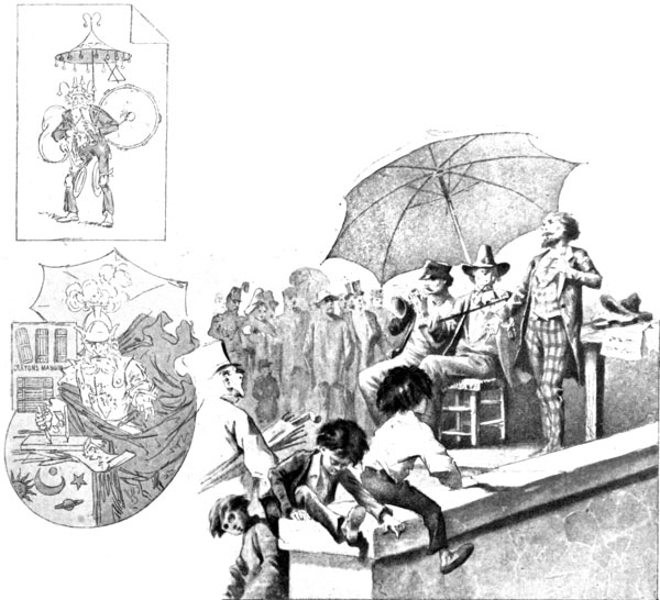 The ancient Romans brought to the decoration of their Parasols a magnificence unknown in our days. They borrowed from the East its stuffs, its jewels, its ornamental style, to enrich in the best manner possible these pretty portable tents. When Heliogabalus, forgetting his sex, after the example of the priests of Atys, appeared on his car clothed with the long dress and all the gewgaws that women wear; when he caused himself to be drawn along surrounded by legions of nude slave-girls, he carried a fan in the guise of a sceptre; and not only was there a golden Parasol in the form of a dais stretched over his head, but also at each side two umbelliferæ held light Sunshades of silk, covered with diamonds, mounted on Indian bamboo, or on a stem of gold carved and encrusted with the most wondrous jewels.