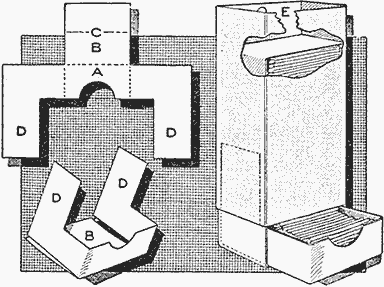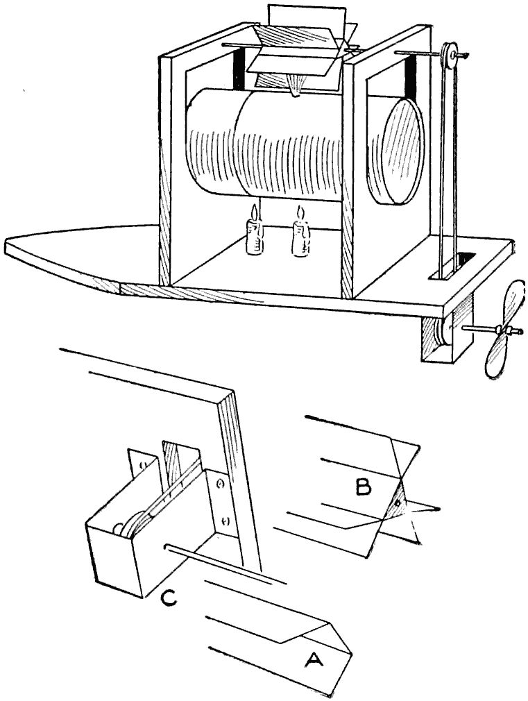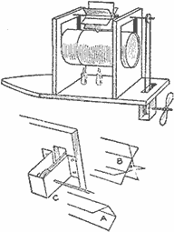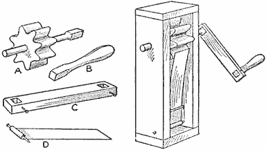 The ratchet wheel A is a disk of hard wood, 1-1/2 in. in diameter. Its rim is divided into eight equal parts, and notched with a knife as shown. It is placed in the forward end of the box on a wood axle of 3/8-in. diameter to which it is glued. One end of this axle is squared and projects 1 in. beyond the side of the box. The squared end passes through a square hole in the end of the crank C, which is a piece of wood 3/4 in. thick, 1 in. wide and 4 in. long, and is fastened with brads and glue. At the other end of the crank, a similar hole connects with a handle whittled to the shape shown at B.