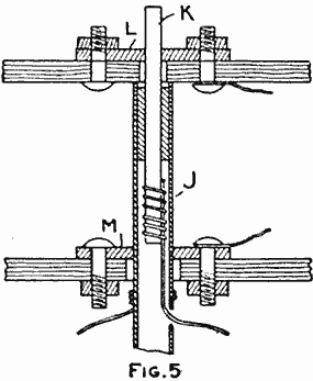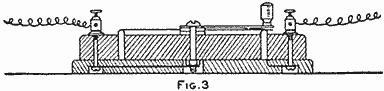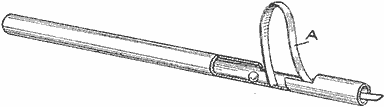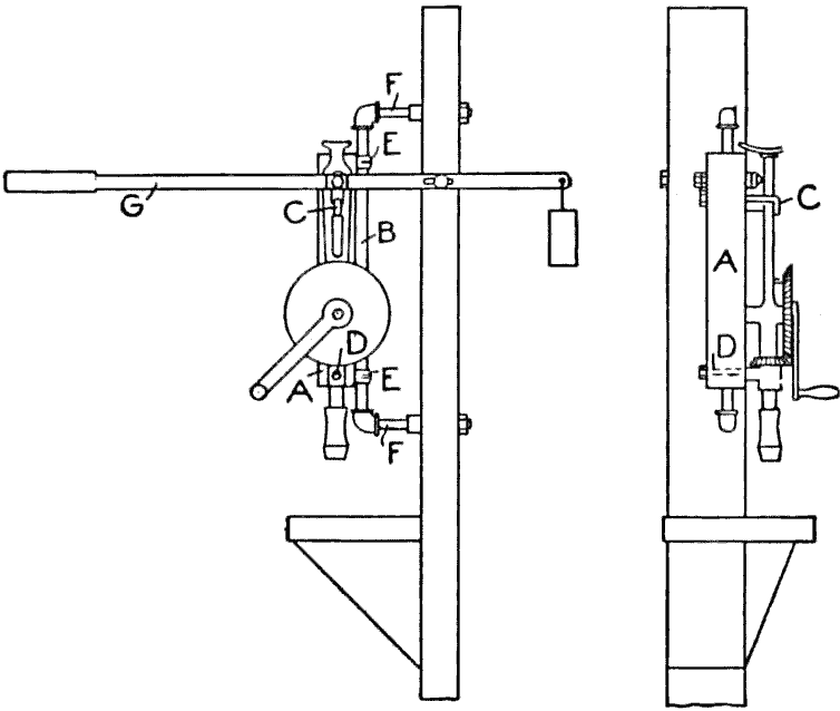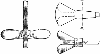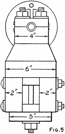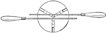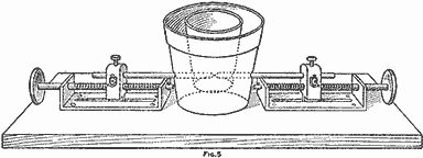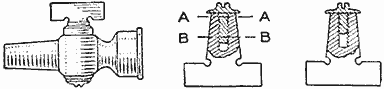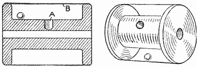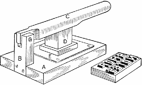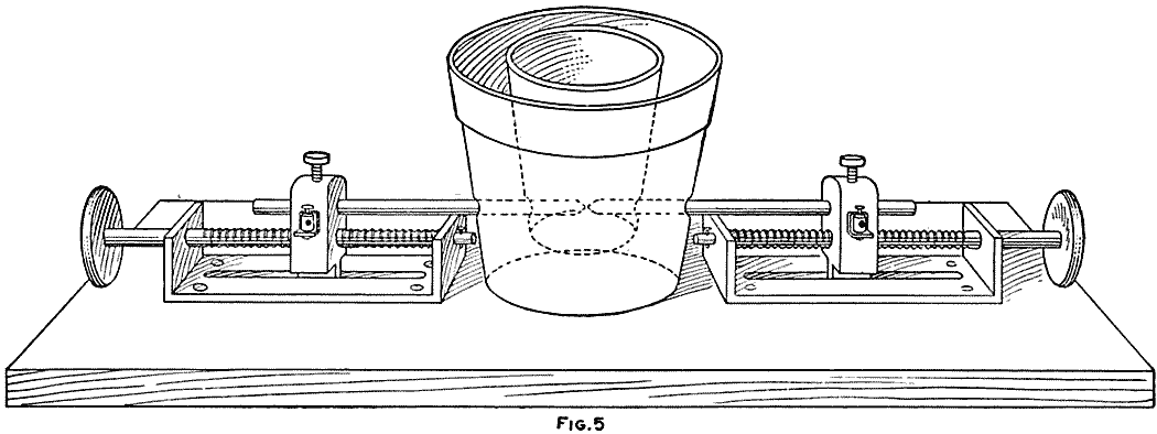 In use, to find and mark the center of a round bar, it is placed in the trough with the end just touching the point of the punch. The brass holding the punch is raised between the parts C until the point of the punch is brought as near to the center of the shaft as can be judged. Press the point of the punch against the end of the shaft and turn the latter in the trough. If the punch marks a circle the center has not been found. This is corrected by slowly moving the punch up or down until the point ceases to make a circle, then the punch is tapped with a hammer to mark the exact center.