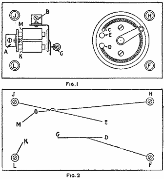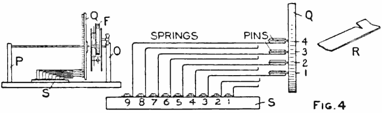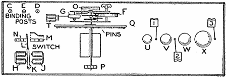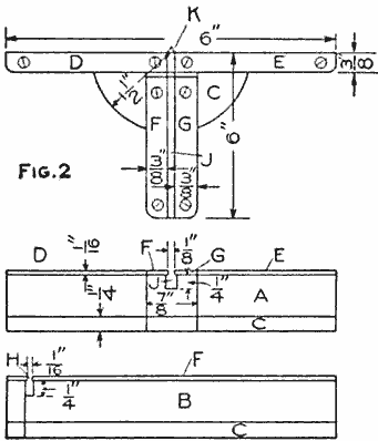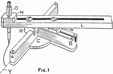 The size of the machine depends on the one building it, but a fair-sized drawing board is sufficient for the beginner. A strip of wood is fastened to the board, near one edge, which has a metal piece on each end, fastened to the under side and bent up over the end to form an extension for the rod to support the moving parts. The strip of wood should be 3/4 in. wide and 1/4 in. thick, and the sliding arm, holding the pencil, 1/2 in. wide and 1/4 in. thick. A like strip, but much shorter than the one fastened to the board, is also fitted with metal pieces in an inverted position so the projections will be downward. A 3/16-in. rod is run through holes in the metal pieces of the strips at both ends, and soldered to those on the strip fastened to the board. This will make a hinged joint, as well as one that will allow the upper strip to slide horizontally.