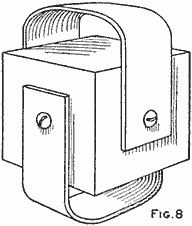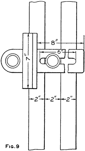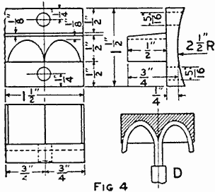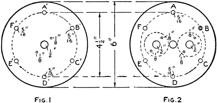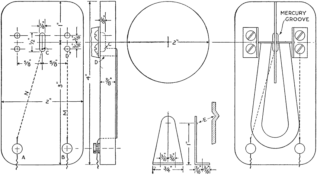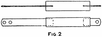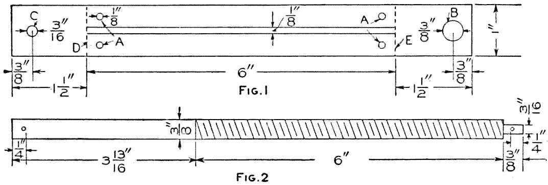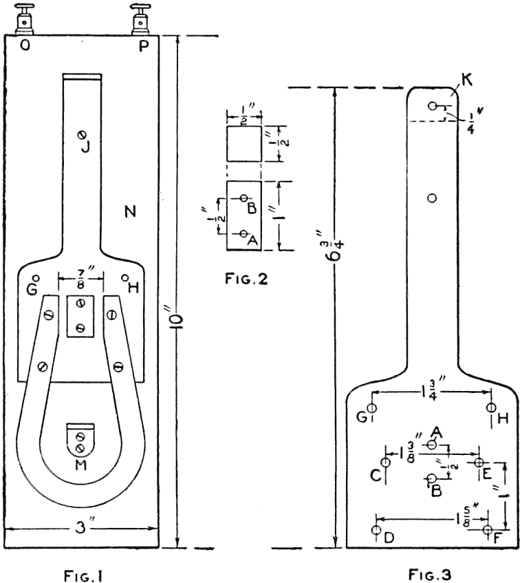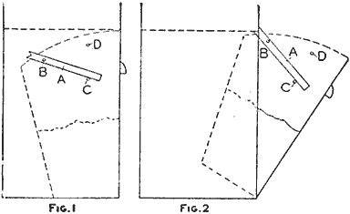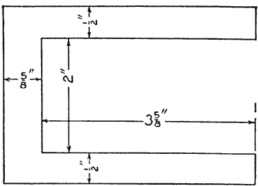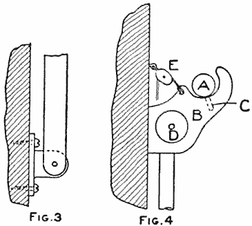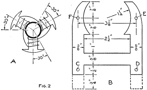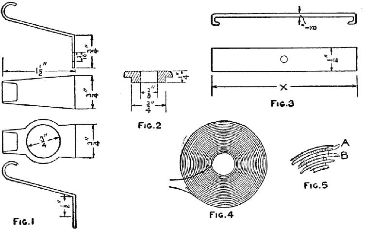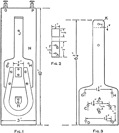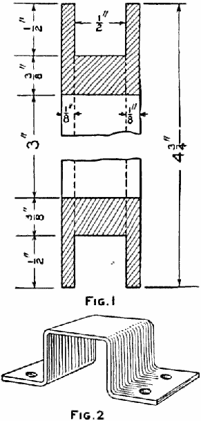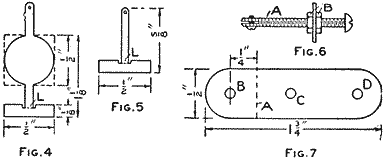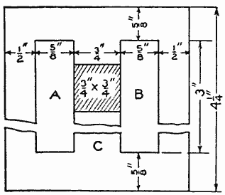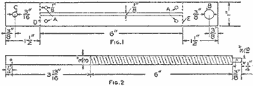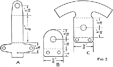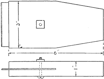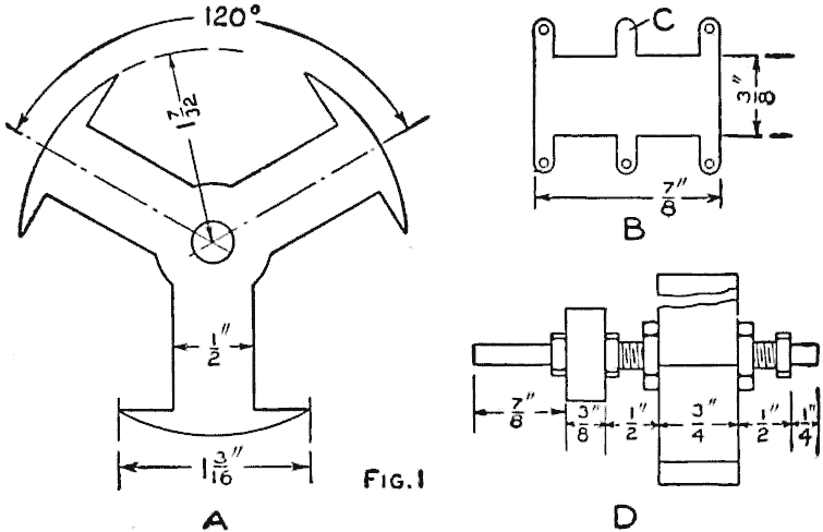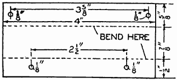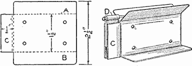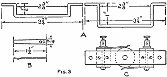 Take two pieces of stiff sheet brass, 2-1/2 by 3 in. in size, and cut two corners, 1/2 in. square, out at one end of each piece as shown in the sketch. Bend the metal on the dotted line A, until it stands at an angle of 45 deg. The part B should be bent up in the same direction, but at right angles to the plate, while the part C should be bent out only slightly. A hole should be drilled near each corner for rivets. Be sure that the two plates are bent in opposite directions, then rivet them firmly together.