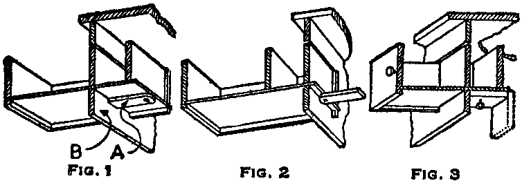 A flour bin, counterbalanced to swing closed at all times, is liable to catch the arm of the one taking out flour. To make it safe, I applied the device shown in the sketch. The bin, at rest, is shown in Fig. 1. The safety catch consists of a stick of wood, A, notched at one end, and is pivoted at B on a small bolt. Two stops, C and D, are located on the side of the box to prevent the catch from being thrown out of position when the bin is quickly pulled out. These stops are nails driven into the box side. When the bin is pulled out the catch takes the position shown in Fig. 2. The catch stick should be a little shorter than the distance the bin is pulled out, so that it may be raised to release the bin for its return.—Contributed by O. F. Fouche, Erie, Pa.