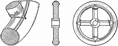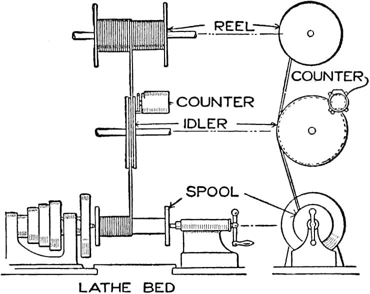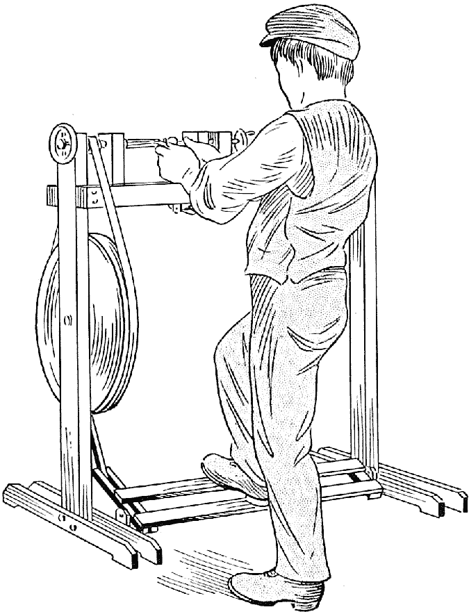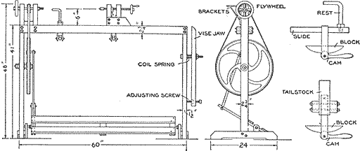 [451] An emery wheel can be used on the spindle in the same manner as the circular saw. Procure a wheel, 5 in. in diameter with a 1/2-in. face and having a lead center. The hole should be bored out and tapped to fit the threads on the lathe spindle, and to have the grinding surface run true, this work should be done in a lathe by a machinist.