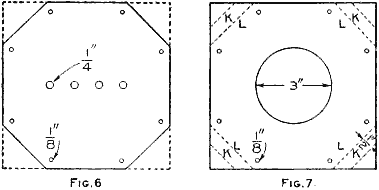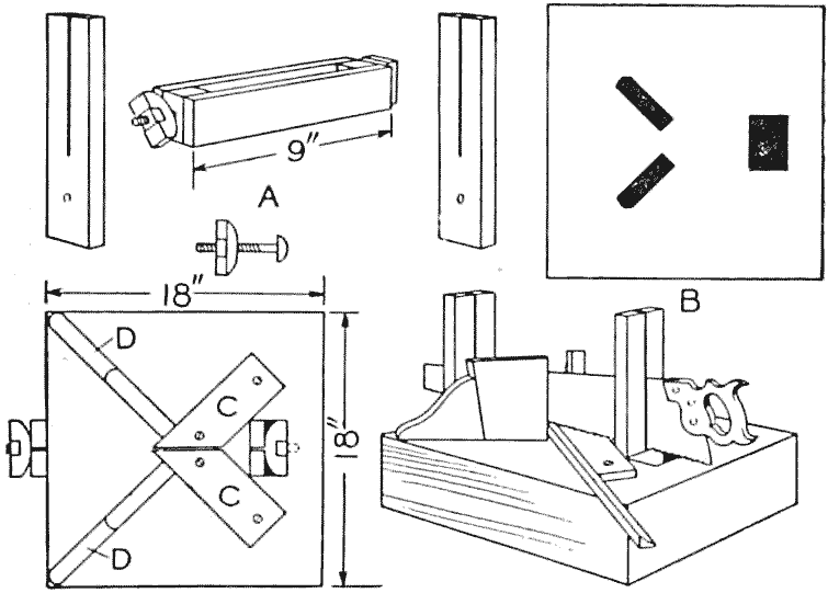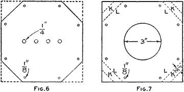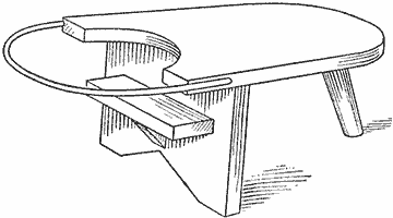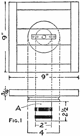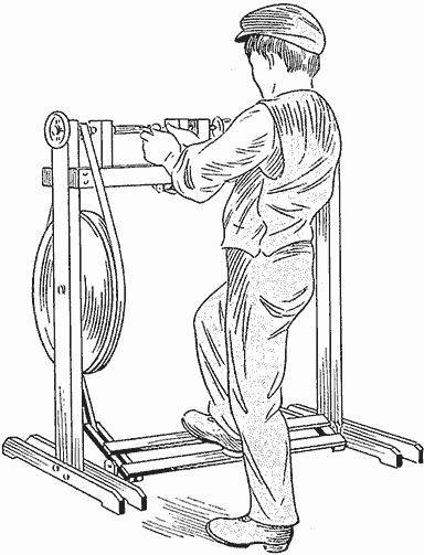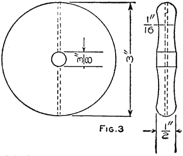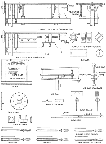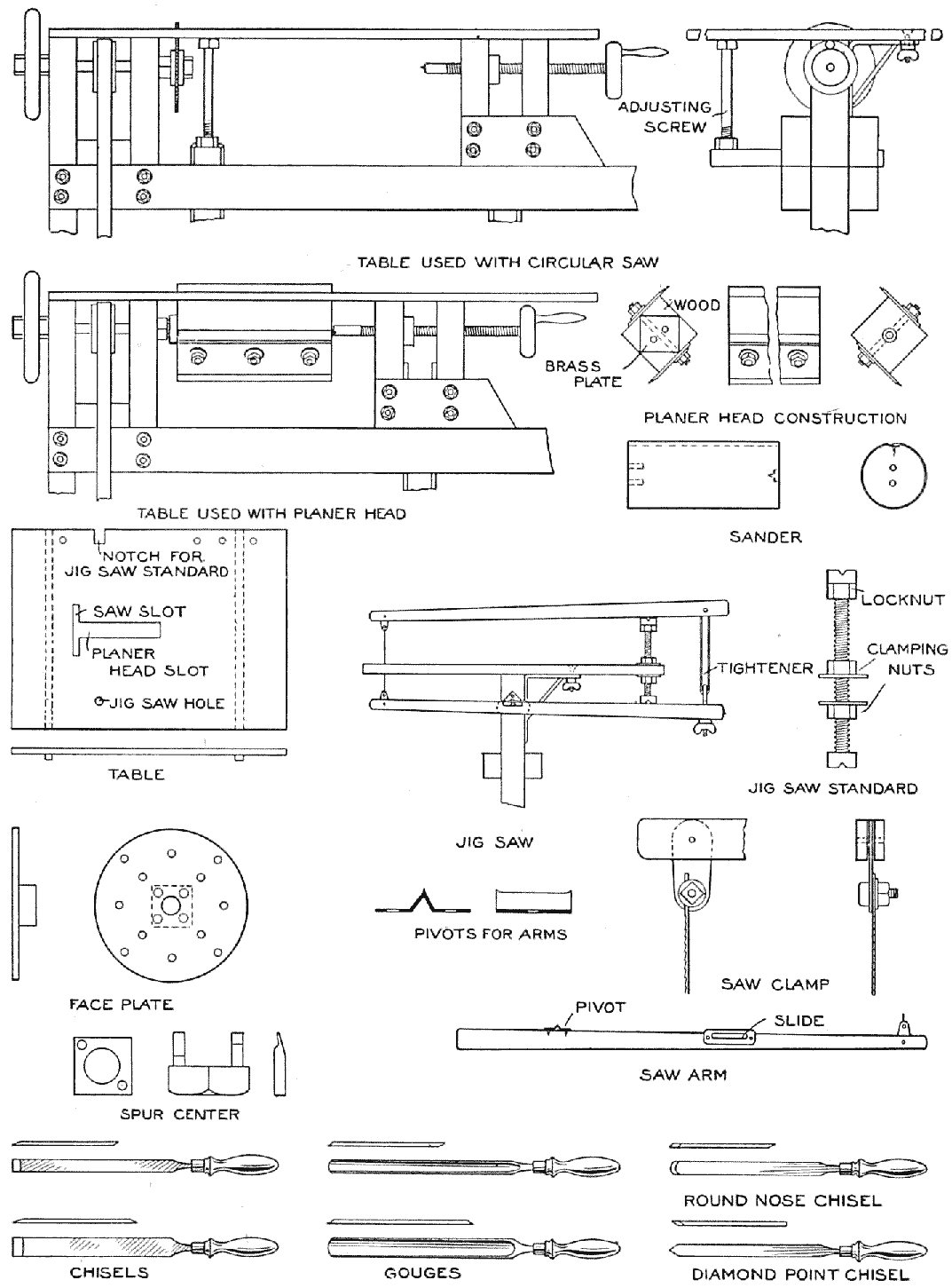 The circular saw is 5 in. in diameter and should have fine teeth. It is placed on the spindle threads against the nut, and held there with another nut and washer on the end of the spindle. The table is attached over the saw, and the spindle is driven at a high speed.