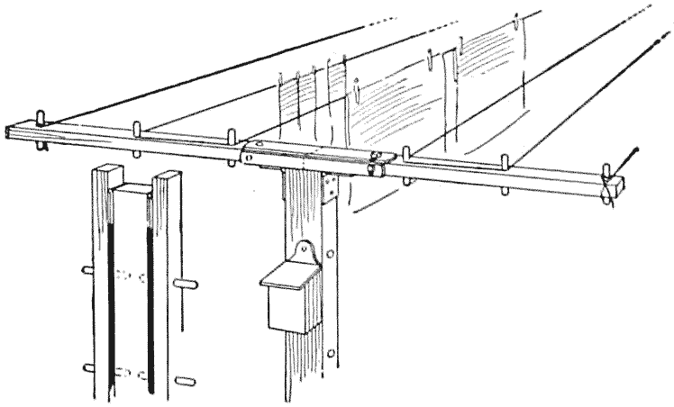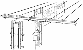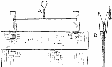 The line is equipped with rings, one at each end, used for convenience in quickly hanging the line, which is then drawn taut with a lever. A screwhook is fastened in one end post and at the other end a screwhook is attached to a lever which is pivoted to the post. The lever should be about 3 ft. long, 1 in. thick, 3 in. wide at one end, and 1-1/2 in. wide at the other, or handle, end. A large wood screw is used to attach it to the post. A pin is placed in the post to hold the lever when the line is drawn taut.—Contributed by Warren E. Crane, Cleveland, Ohio.