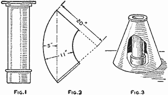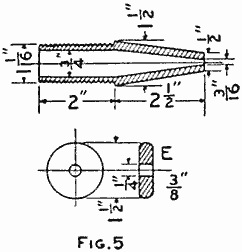 The combustion chamber is made of a piece of brass tubing driven over the end of the smaller tube on the spout. About 1/2 in. from the back end of the larger tube four or more holes are drilled to admit air to the gas.